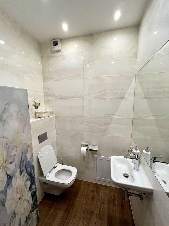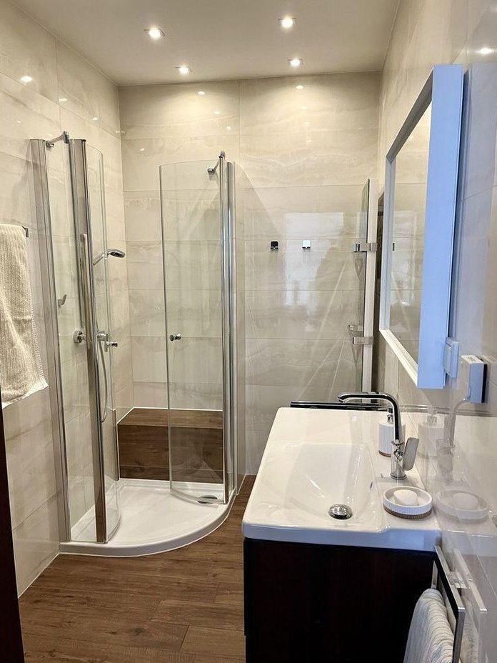 Na podłogach w salonie i pokojach znajduje się deska z orzecha amerykańskiego. Kuchnia, łazienki i przedpokój wykończone włoskimi płytkami Marazzi, a ściany w łazienkach płytkami z kolekcji Evolution Marble Onice. W przedpokoju znajduje się pojemna zabudowa garderobiana. Do dyspozycji są dwie łazienki: przestronna z prysznicem oraz osobne WC.