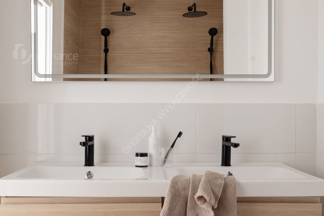 elegancka łazienka w układzie „Jack & Jill” z podwójną umywalką i dwoma natryskami.