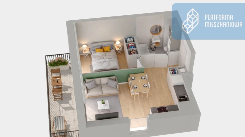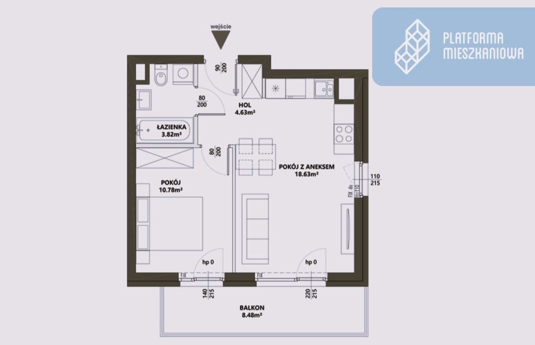 - Pokój dzienny z aneksem kuchennym i wyjściem na balkon (dodatkowe okno od wschodu)