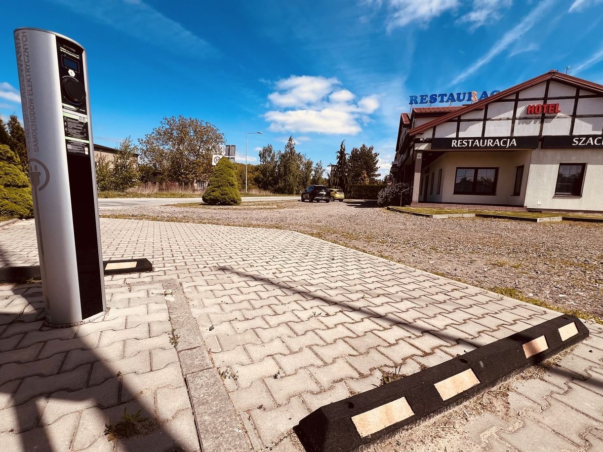 Na terenie parkingu stacja do ładowania samochodów elektrycznych