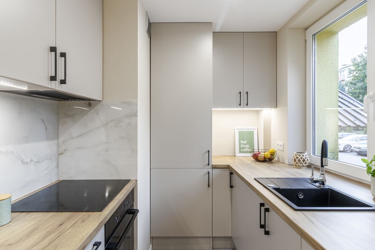 kuchnia wyposażona w sprzęt AGD, łącznie z pralką z gwarancją 5 lat
