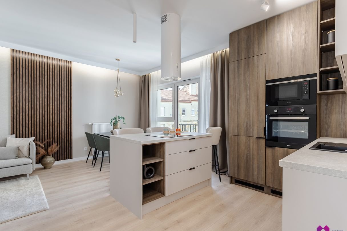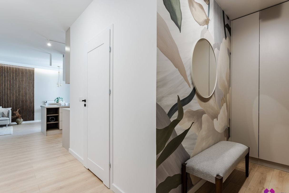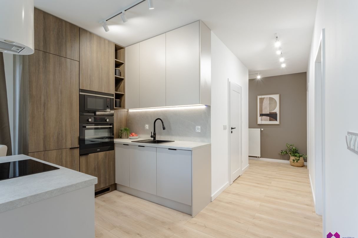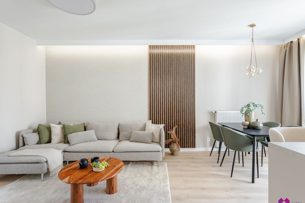 Mieszkanie w podwyższonym standardzie, wykończone pod klucz według najnowszych trendów. We wnętrzu panują odcienie beżu, szarości oraz drewna co sprawia, że mieszkanie jest niezwykle eleganckie ale również przytulne. Dodatkowo, w celu uzupełnienia wnętrza zastosowano zielone oraz brązowe elementy w postaci dodatków.