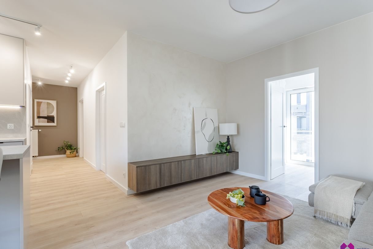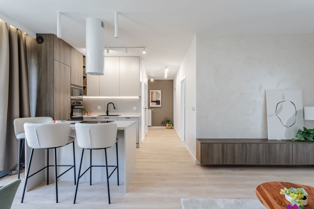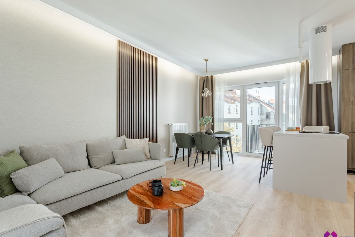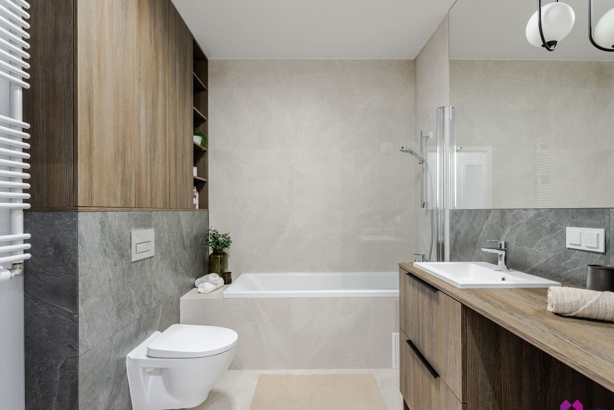 Mieszkanie w podwyższonym standardzie, wykończone pod klucz według najnowszych trendów. We wnętrzu panują odcienie beżu, szarości oraz drewna co sprawia, że mieszkanie jest niezwykle eleganckie ale również przytulne. Dodatkowo, w celu uzupełnienia wnętrza zastosowano zielone oraz brązowe elementy w postaci dodatków.