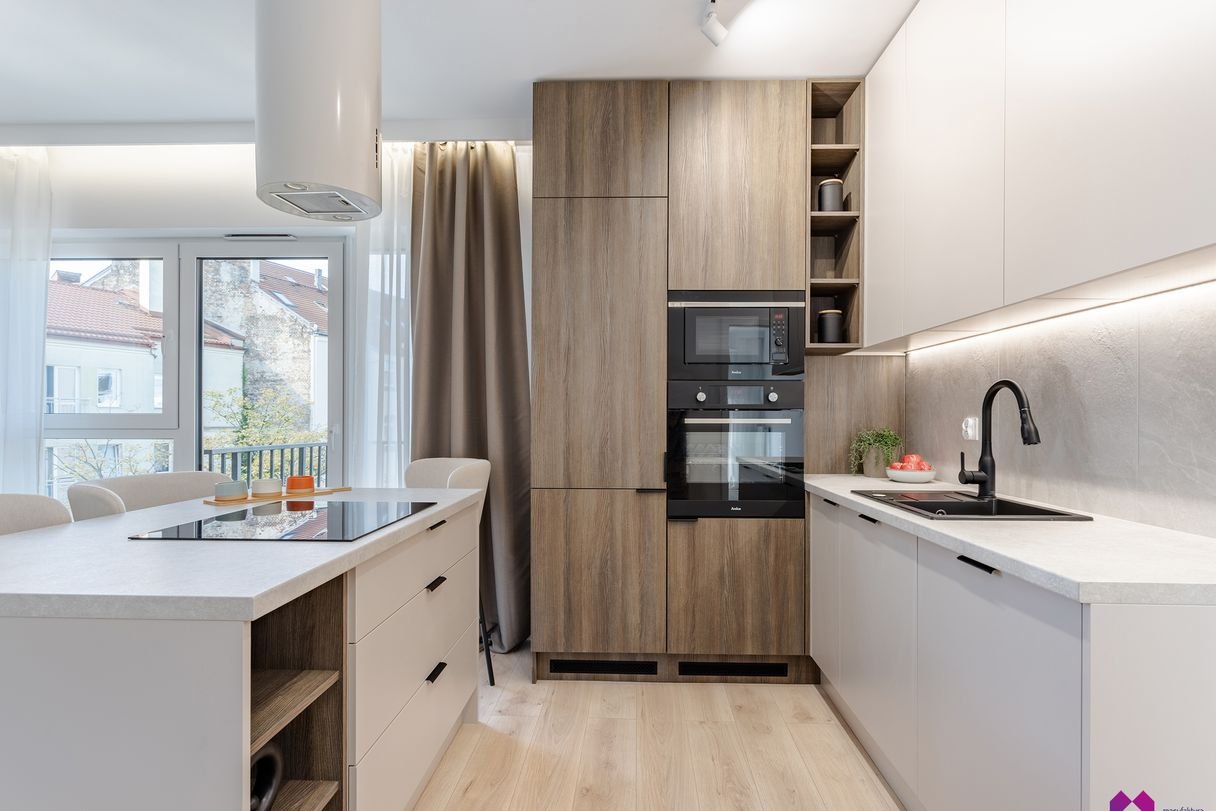 Aneks kuchenny wyposażony został w nowy sprzęt AGD (piekarnik, mikrofalę, płytę indukcyjną oraz okap), przygotowano także miejsce na lodówkę i zmywarkę w zabudowie.