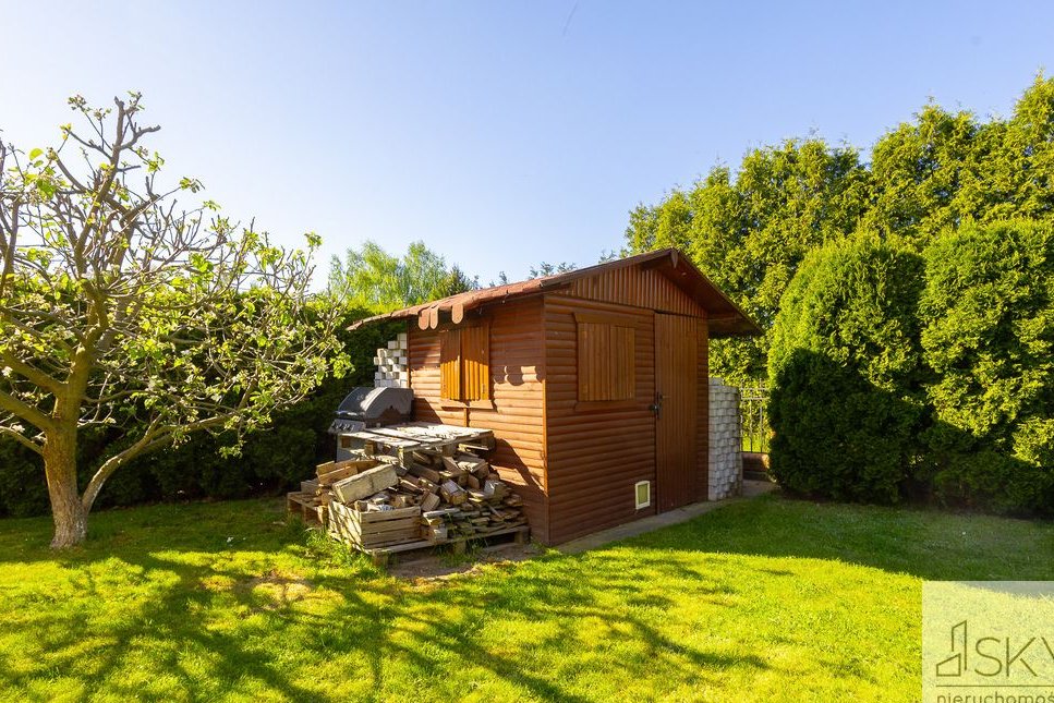 Zadbany ogród oferuje idealne warunki do relaksu, letnich spotkań przy grillu oraz bezpiecznej zabawy dla dzieci. Na posesji znajduje się praktyczny domek narzędziowy, który pełni również funkcję składu na drewno kominkowe.