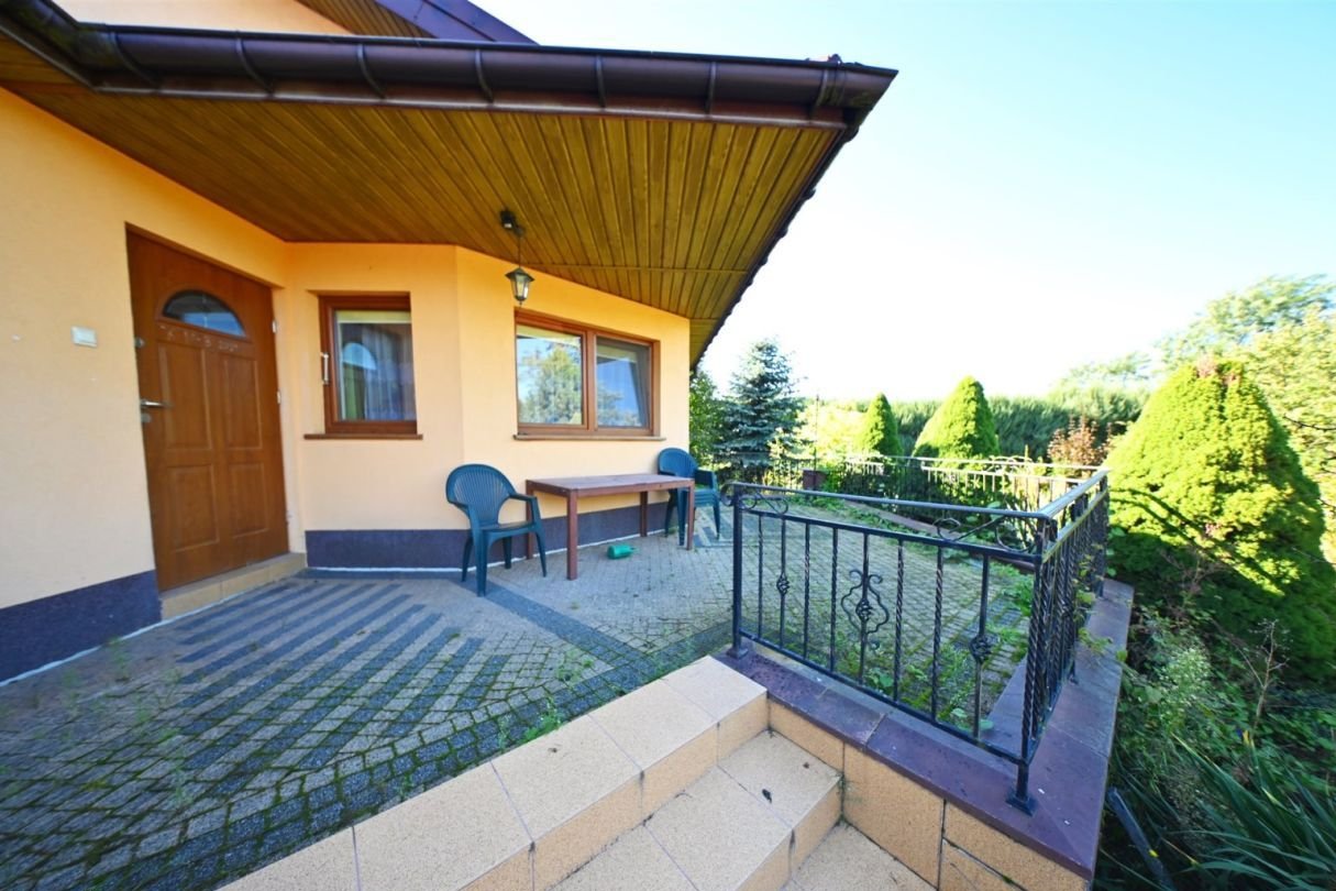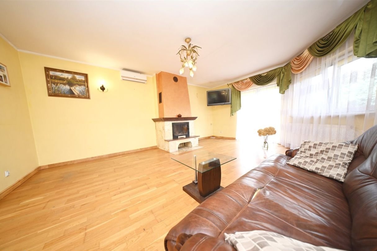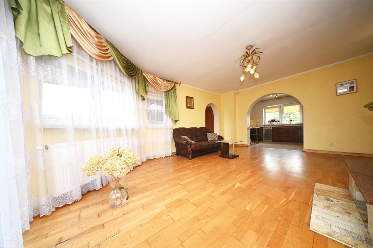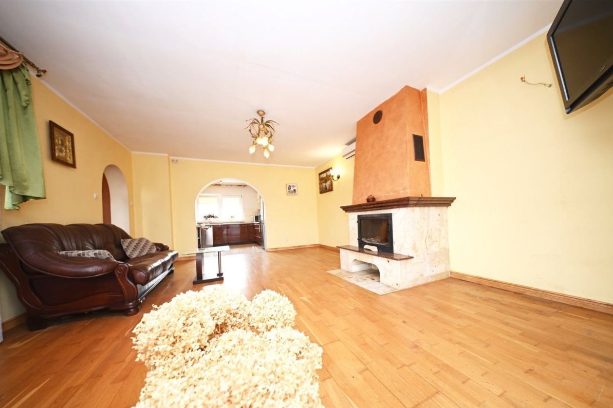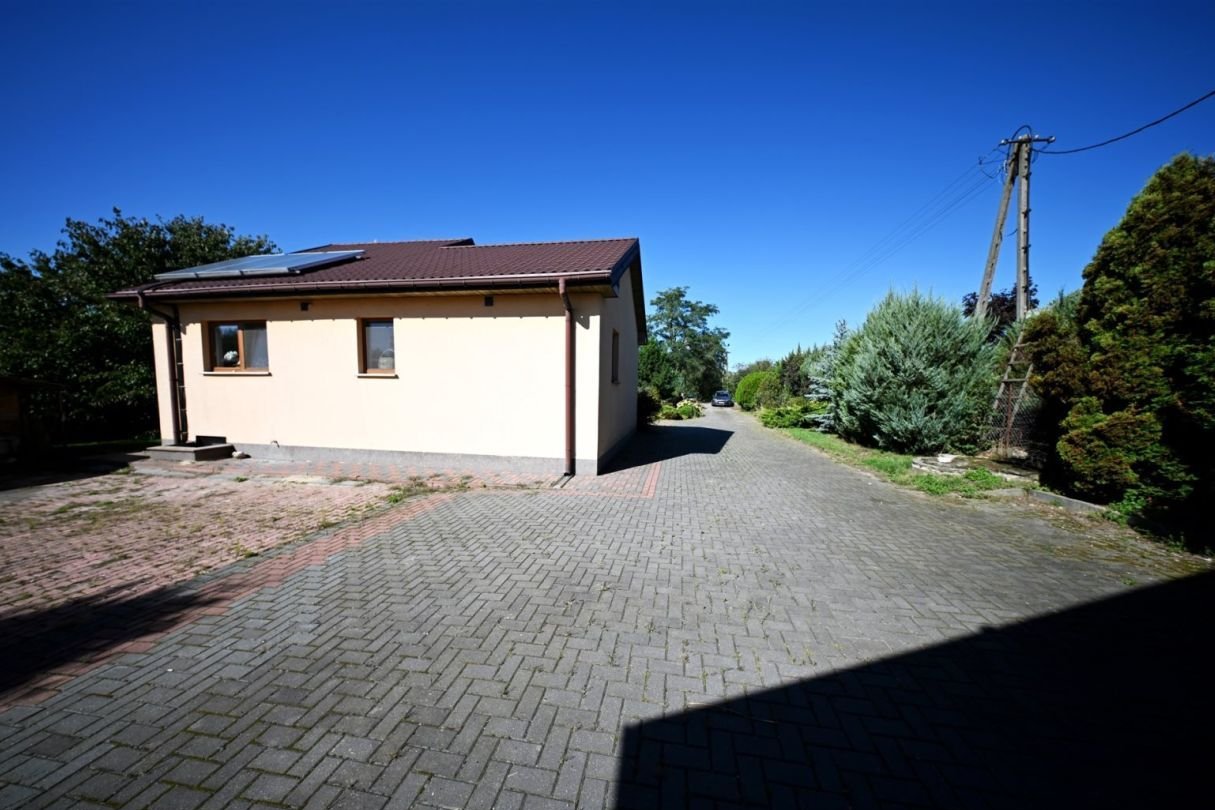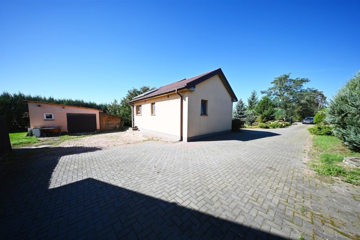 Pomieszczenie gospodarcze – 7 m²Na działce znajduje się również duży murowany garaż wolnostojący mieszczący jeden samochód.Standard budynku:tradycyjna, solidna konstrukcja murowanadom docieplony styropianem o grubości 10 cm, strop wełną mineralną 25 cmdach pokryty blachodachówkąokna trzyszyboweogrzewanie podłogowe w przedpokoju, kuchni oraz w łazience reszta pomieszczeń grzejnikiprąd