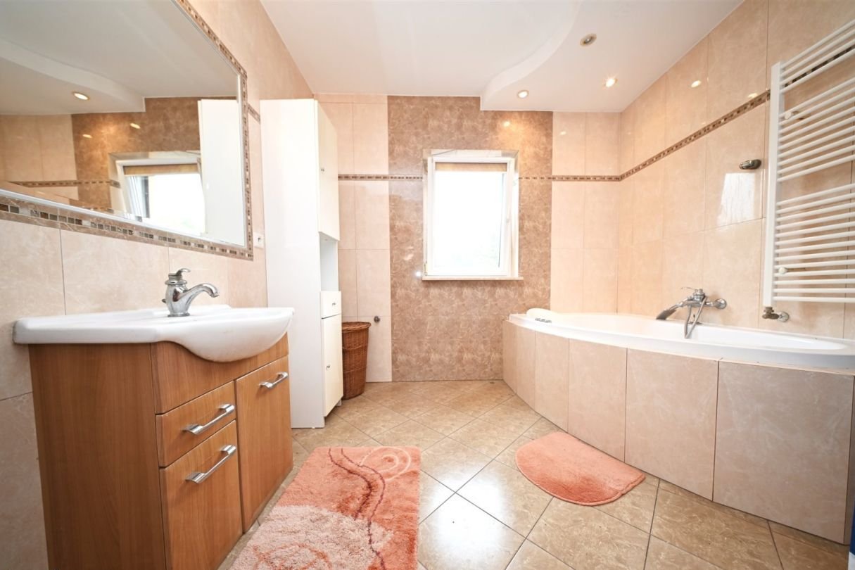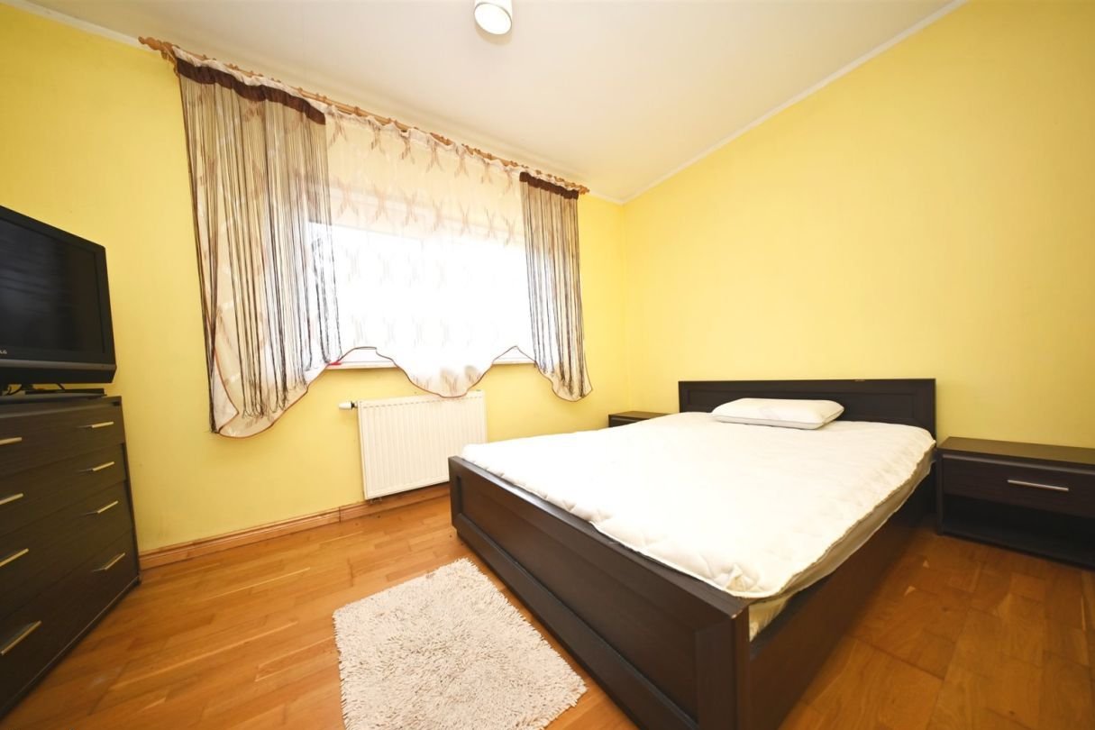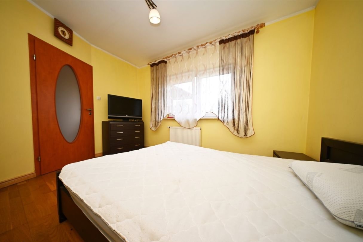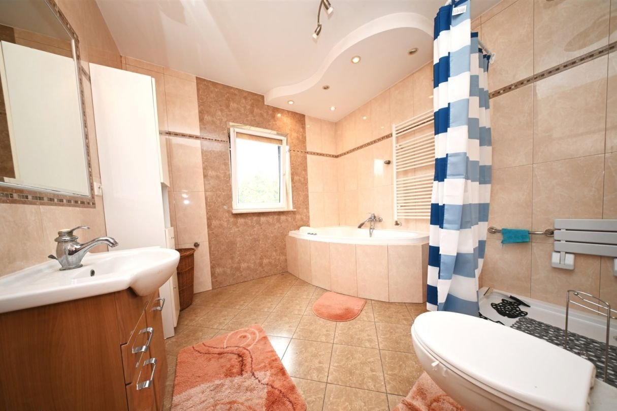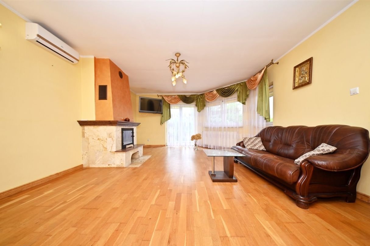 Pomieszczenie gospodarcze – 7 m²Na działce znajduje się również duży murowany garaż wolnostojący mieszczący jeden samochód.Standard budynku:tradycyjna, solidna konstrukcja murowanadom docieplony styropianem o grubości 10 cm, strop wełną mineralną 25 cmdach pokryty blachodachówkąokna trzyszyboweogrzewanie podłogowe w przedpokoju, kuchni oraz w łazience reszta pomieszczeń grzejnikiprąd