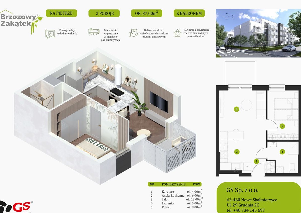 Budynek charakteryzuje się nowoczesnym stylem wykończenia elewacji oraz funkcjonalnym układem mieszkań. Na terenie osiedla istnieje możliwość wykupienia miejsca postojowego, co zwiększa komfort codziennego użytkowania.