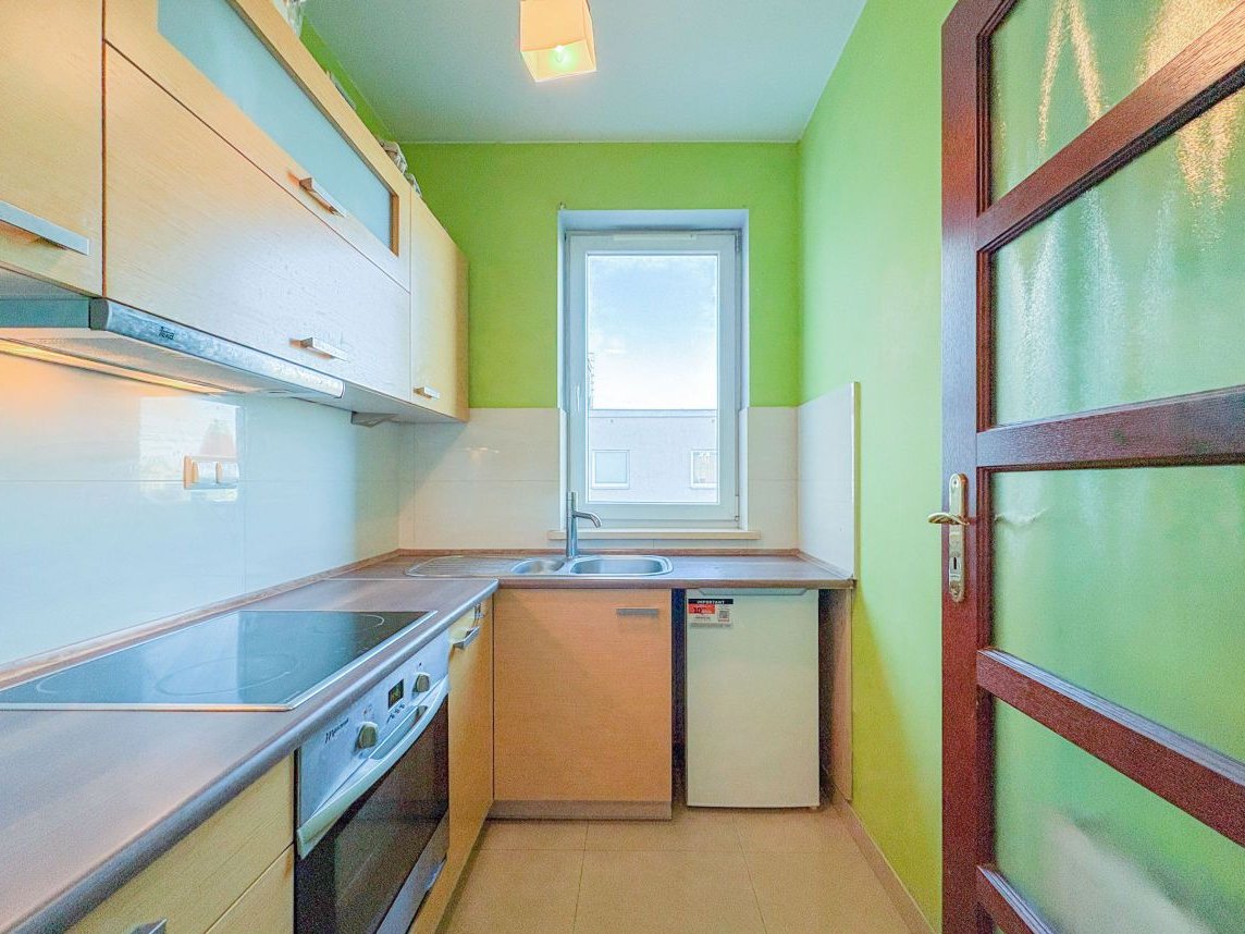 Oddzielna kuchnia w zabudowie jasnymi meblami z niezbędnymi sprzętami AGD: lodówka podblatowa, kuchenka ceramiczno-elektryczna, okap,