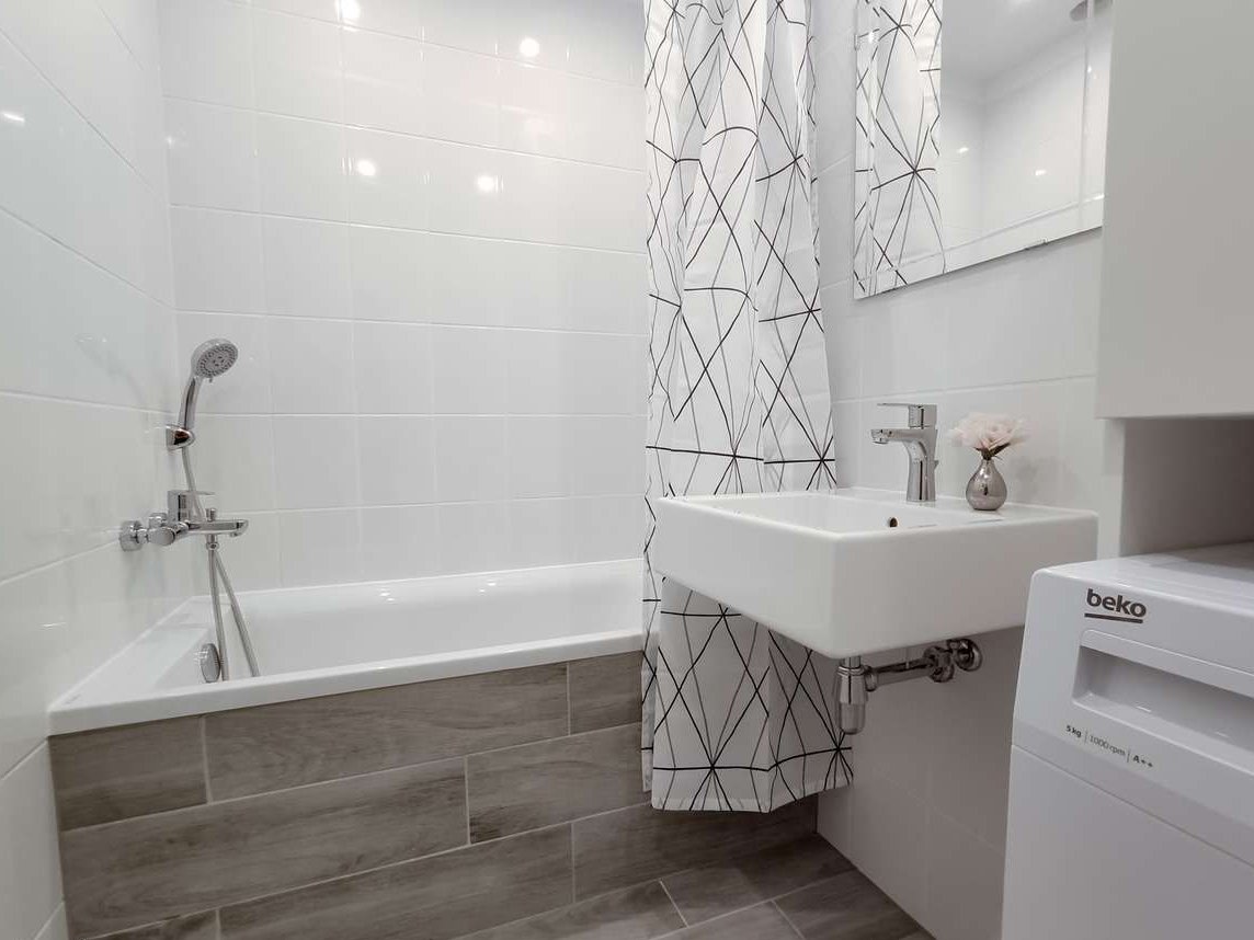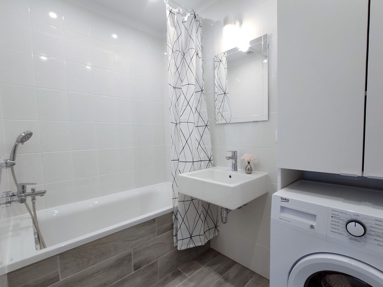 Łazienka: wanna, szafka z umywalką, pralka
