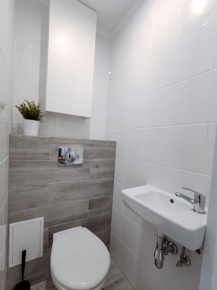 Osobne WC: sanitariaty, umywalka, szafki w zabudowie