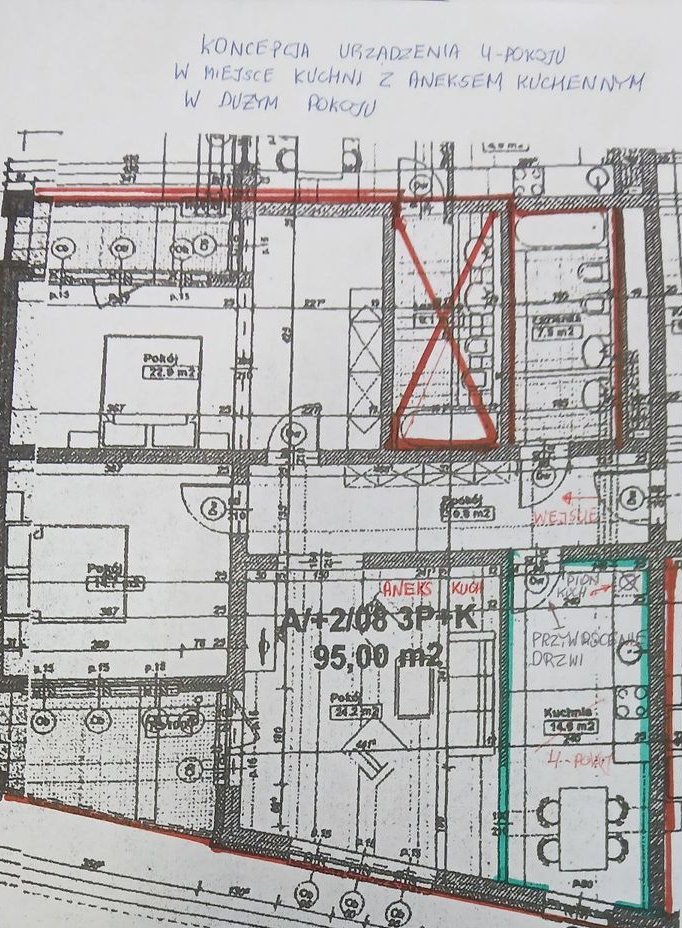Dodatkowo — po konsultacji z hydraulikiem oraz architektem powstała wizualizacja funkcjonalnej zmiany układu, dzięki której możesz zyskać 4. pokój! Przebudowa zakłada umieszczenie dodatkowego pokoju w aktualnej kuchni, zaś kuchnia znalazła by się jako aneks w obecnym salonie.