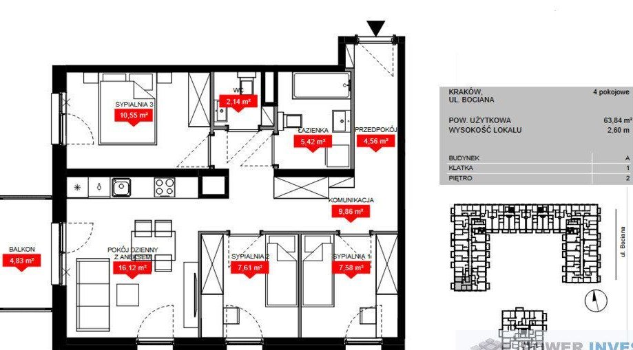 Mieszkanie znajduje się na II piętrze, ma powierzchnię 63,84 m2 i składa się z: