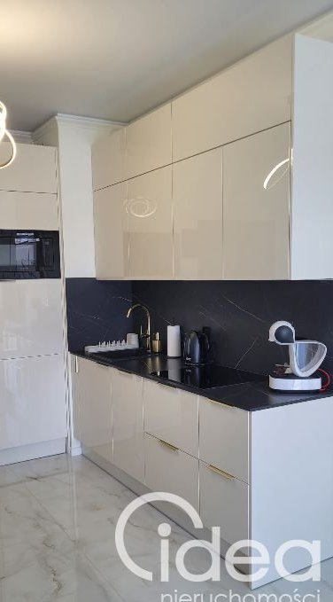 Kuchnia wyposażona w niezbędne sprzęty AGD m.in. lodówka, zmywarka, ekspres do kawy.
