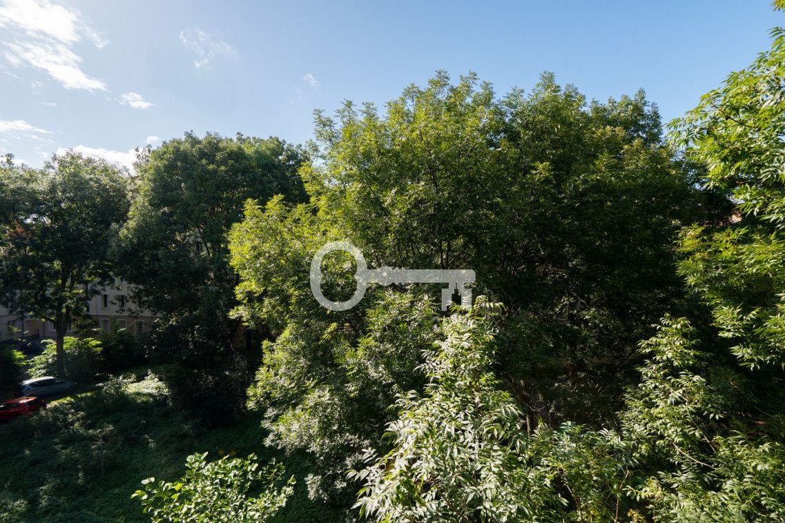 * Living room - bright and functional, with a large window and access to a balcony overlooking greenery. Wooden parquet flooring.
