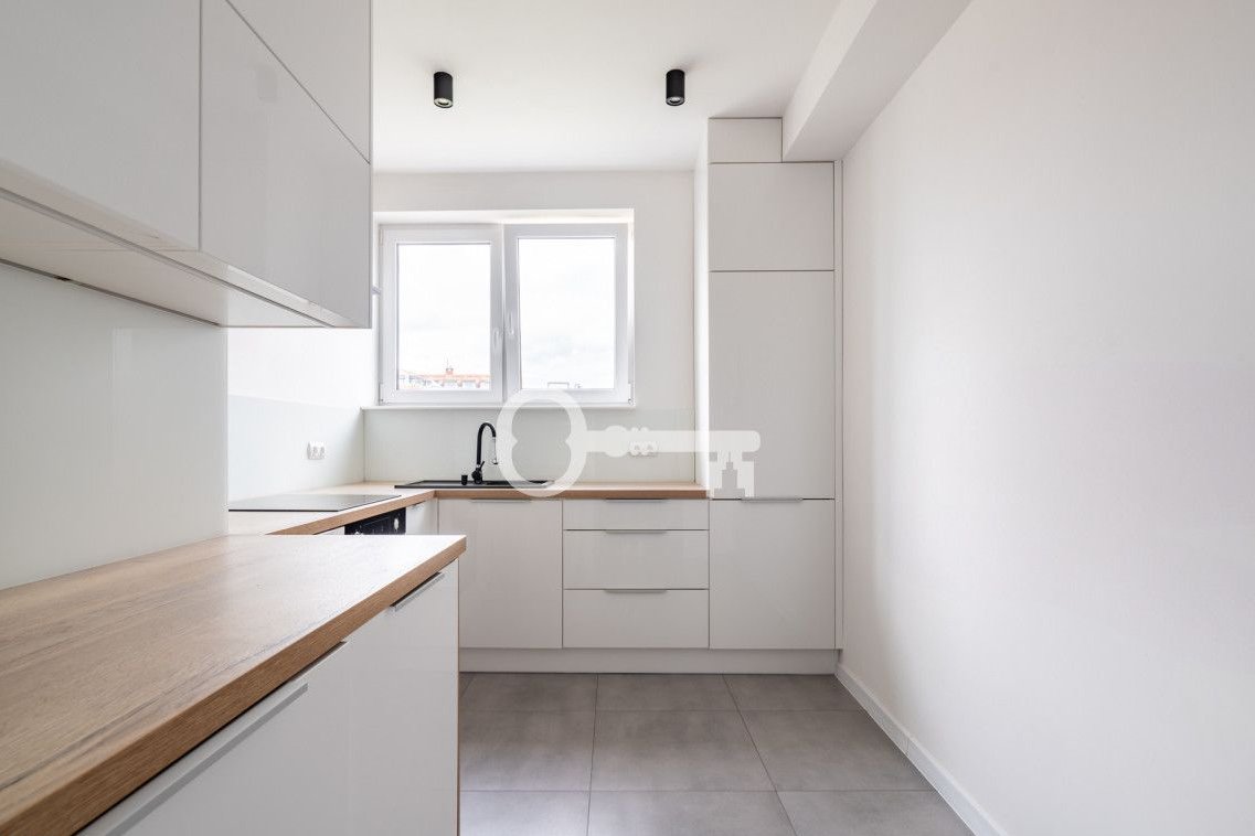 * Kuchnia - oddzielna, z oknem, w pełni wyposażona w nowoczesne meble na wymiar, piekarnik, płytę grzewczą i zmywarkę, minimalistyczna biel i drewniane blaty tworzą nowoczesny, minimalistyczny klimat.