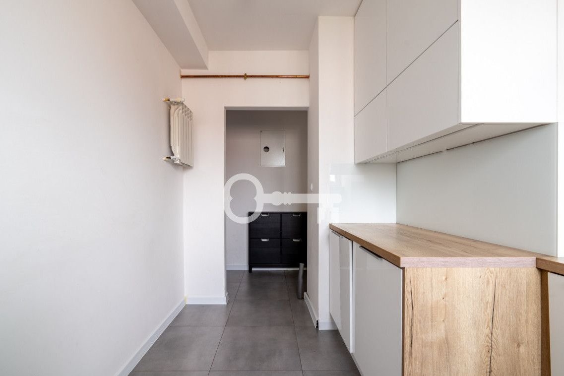 * Kitchen - separate, with a window, fully equipped with modern custom-made furniture, oven, hob, and dishwasher. Minimalist white and wooden countertops create a modern, minimalist atmosphere.