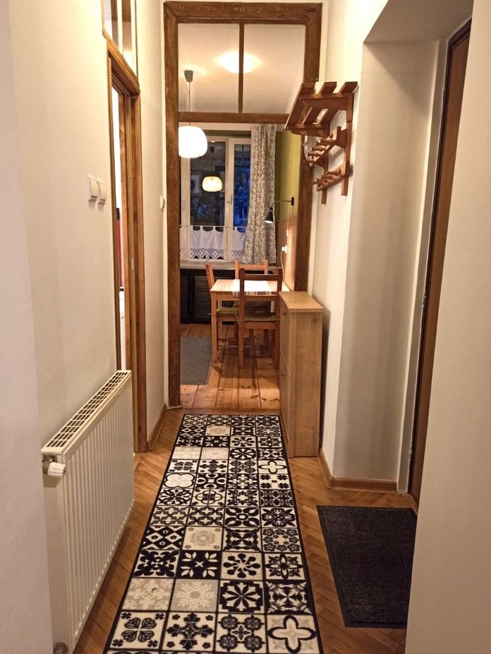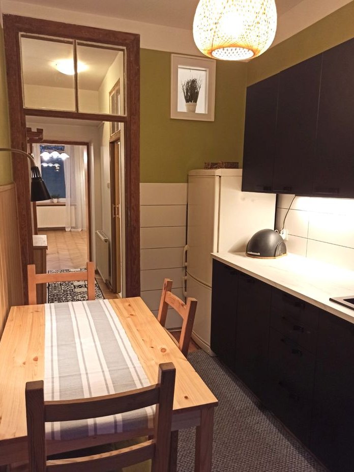 Wykończenie: pokój i przedpokój - dębowy parkiet, kuchnia - sosnowe deski, glazura, panele ścienne, łazienka - gres i glazura, wc i piony w zabudowie, parapet i ościeżnice - lite drewno, ściany - gładzie gipsowe. Wszystkie drewniane elementy są oryginalne.