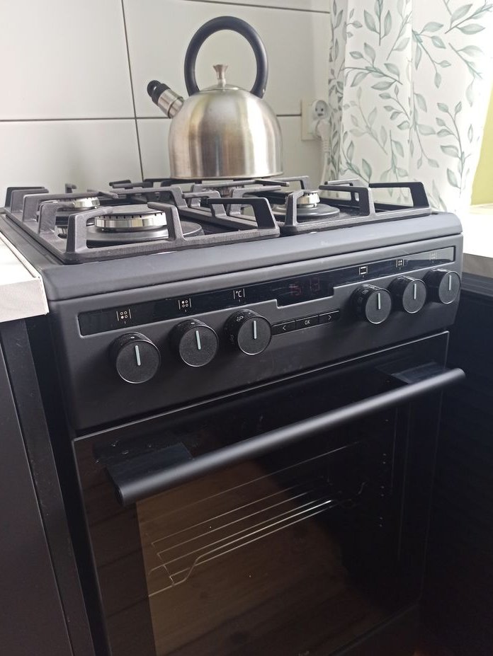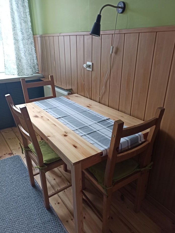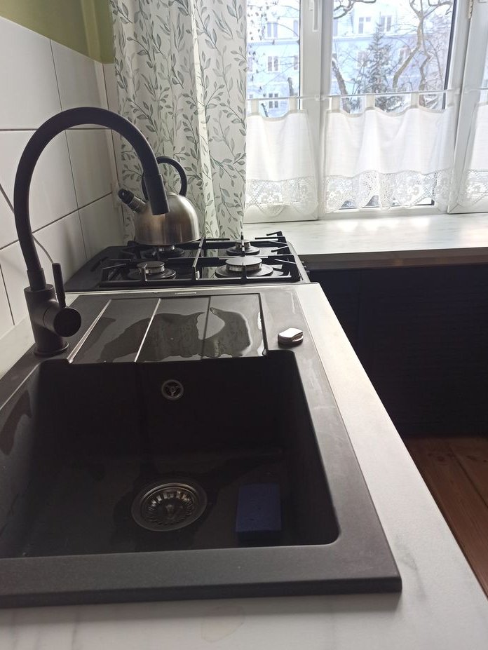 nowe wyposażenie (XI-XII 2025): kuchenka gazowo-elektryczna z funkcją pieczenia pizzy, bateria w kuchni, bateria umywalkowa: Grohe, dozownik, stół z drewna sosnowego, karnisze, firany, zasłony, chodnik, wycieraczki, lampa w kuchni.