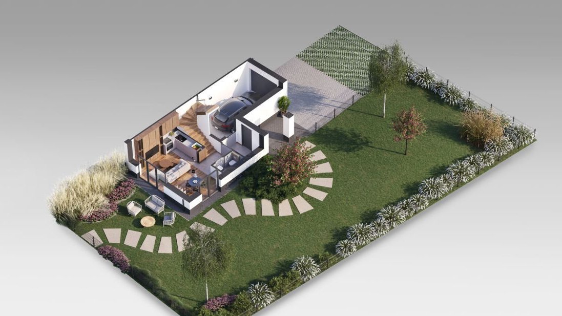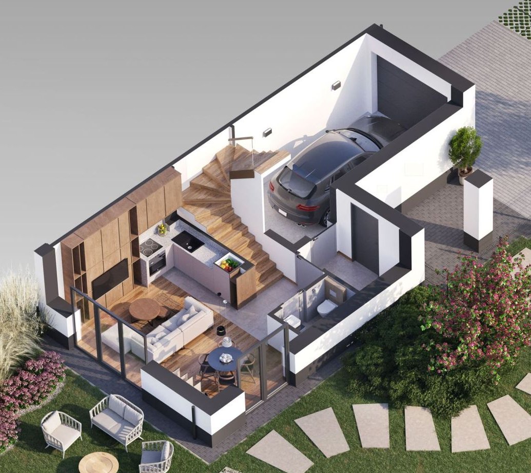 Parter: salon z aneksem kuchennym i wyjściem do ogrodu, toaleta, ogrzewany garaż z instalacją wod/kan w bryle budynku.