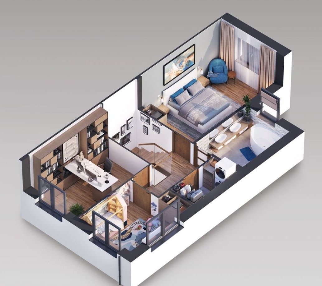 4 pokoje: parter - salon z aneksem, piętro - 3 sypialnie + łazienka + garderoba