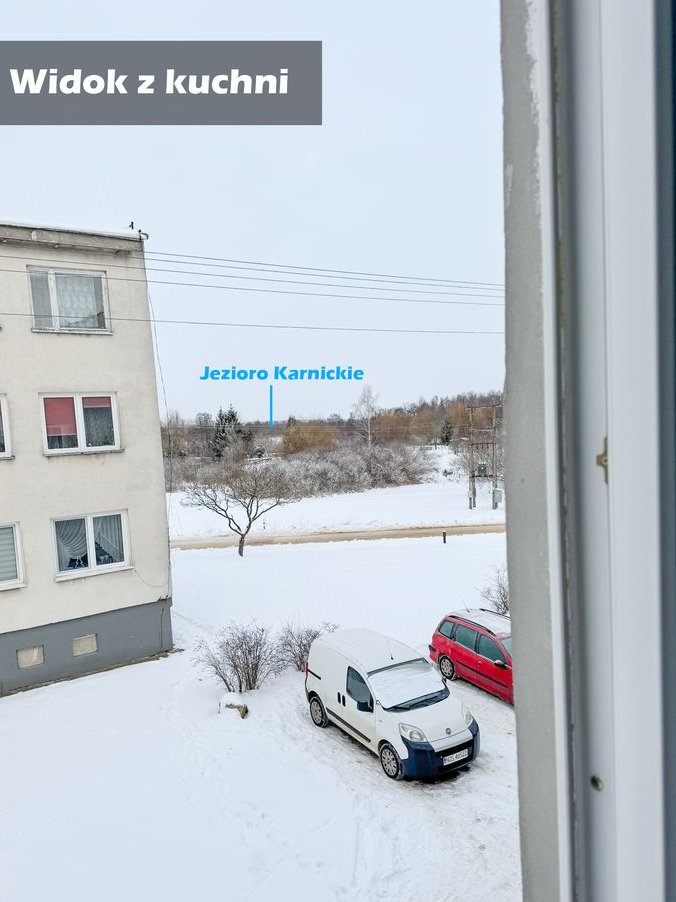 Mieszkanie znajduje się w Karnitach, w gminie Miłomłyn, w spokojnej i zielonej okolicy. Karnity leżą ok. 13 km od Miłomłyna i ok. 27 km od Ostródy, co zapewnia dobrą komunikację z większymi miastami, a jednocześnie ciszę i bliskość natury.