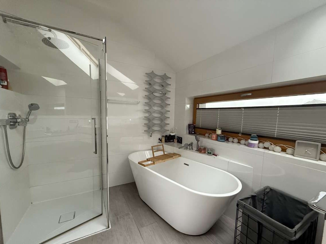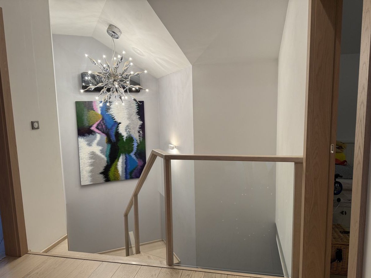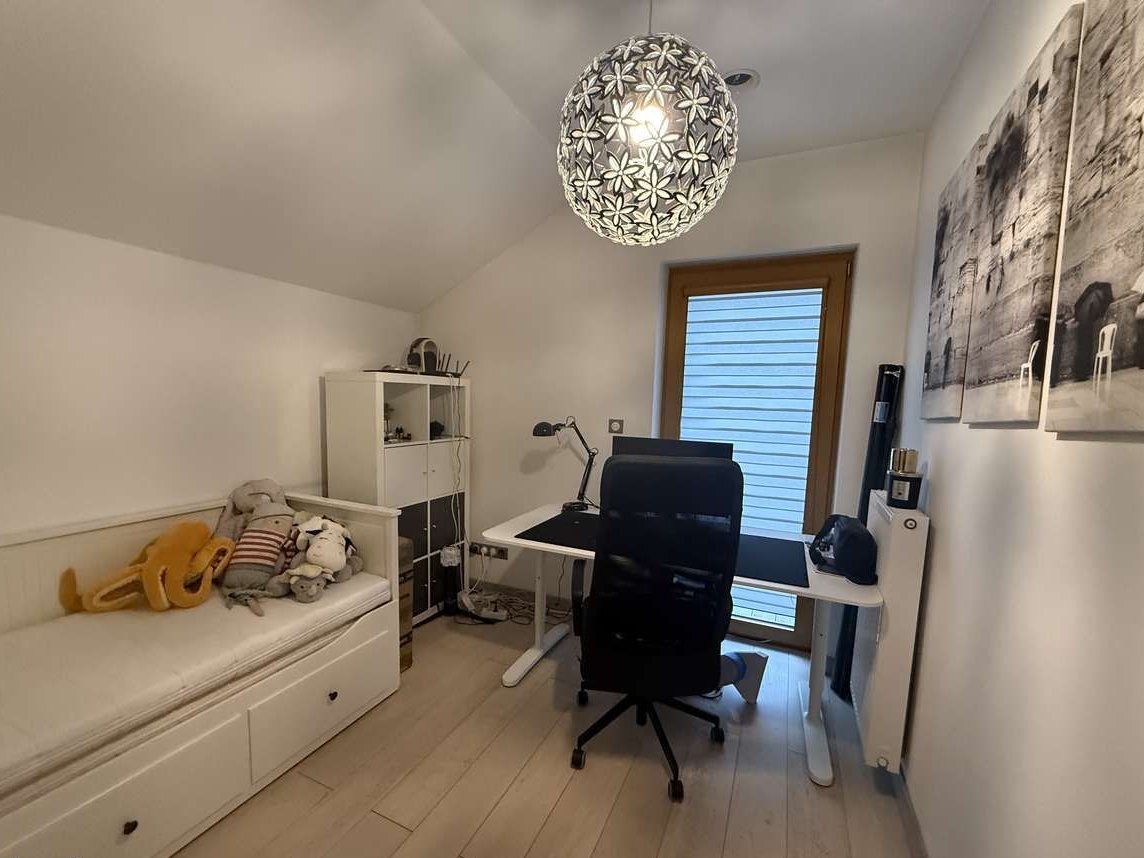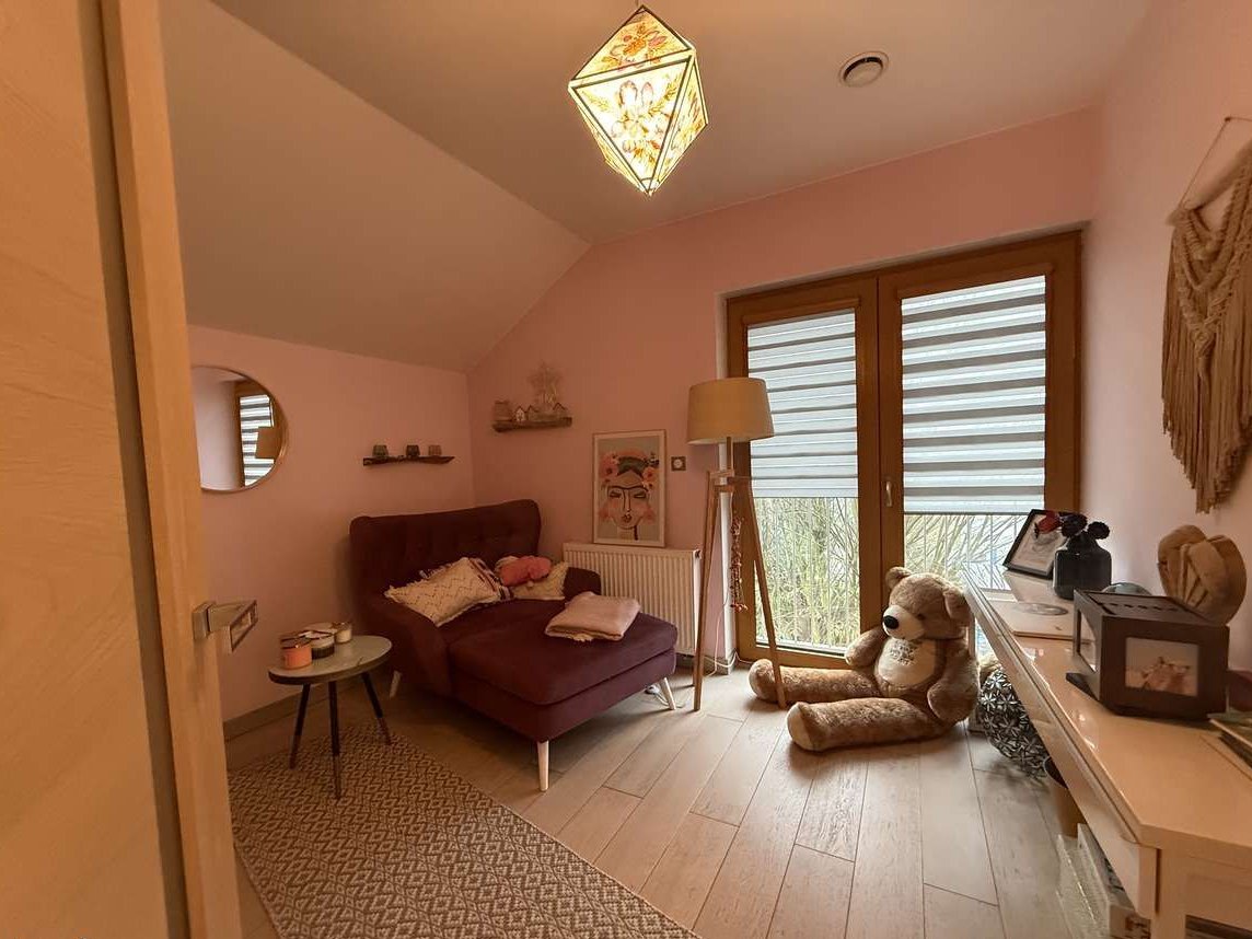 Na piętrze: 3 pokoje, garderoba/składzik, duża łazienka z wanną i prysznicem, przestronna sypialnia z własną garderobą.