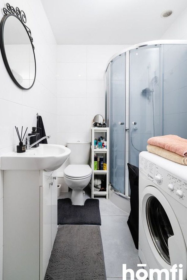 -The bathroom has a spacious shower cabin, a sink with a cabinet, a toilet, and a washing machine.