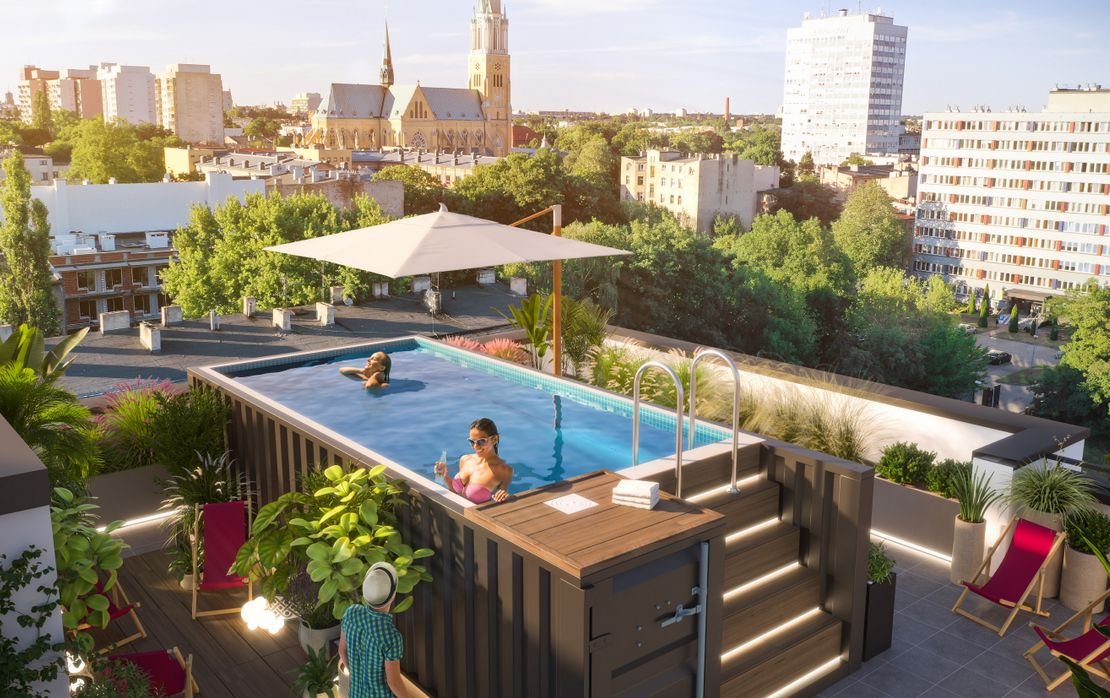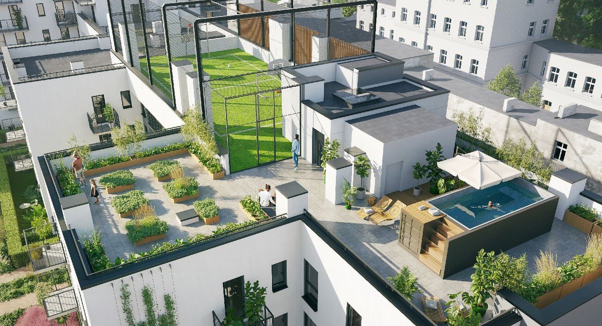Dla lokatorów do dyspozycji będzie: Ogród i basen z przeciwprądem na dachu budynku. Rowerownia. Pralnia. Myjnia dla piesków. Boisko multifunkcyjne. Ładowarka elektr. do sam. Sauna fińska. Balia z zimną wodą do morsowania oraz jakuzzi : )