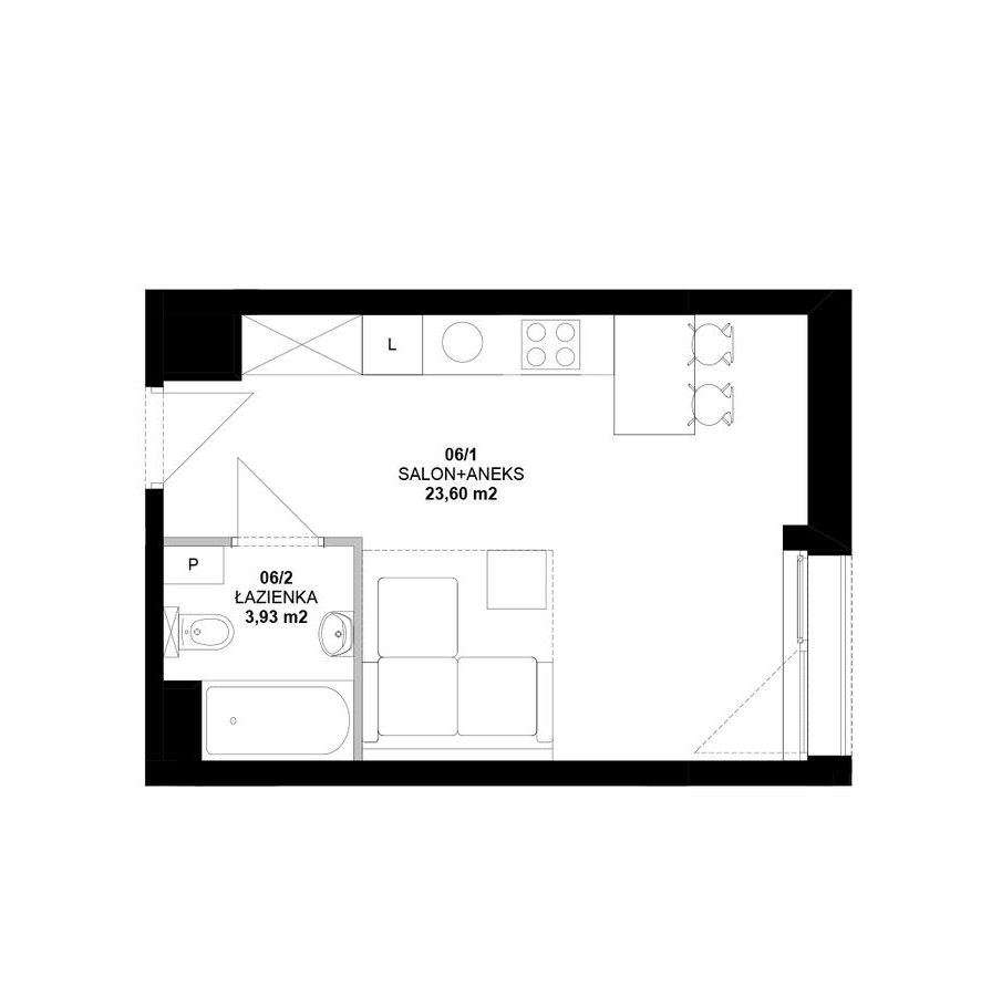Lokal o powierzchni 27,22 m² został zaprojektowany w sposób przemyślany i funkcjonalny. Składa się z dużego, jasnego pokoju dziennego, który może pełnić jednocześnie funkcję strefy wypoczynkowej oraz sypialnianej, a także z łazienki. Duże okna zapewniają bardzo dobre doświetlenie wnętrza, co sprawia, że mieszkanie jest jasne i komfortowe w codziennym użytkowaniu, mimo kompaktowego metrażu.