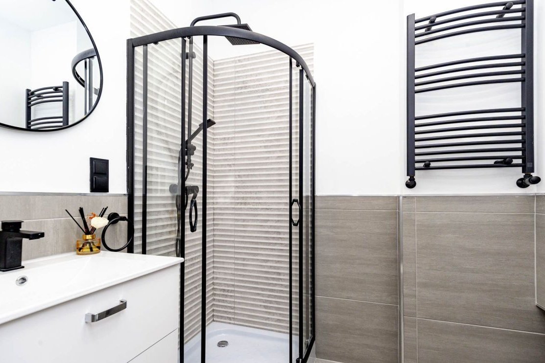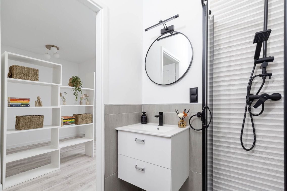 • Łazienka po gruntownym remoncie z prysznicem, szafka z umywalką, wc, lustro, miejsce na pralkę
