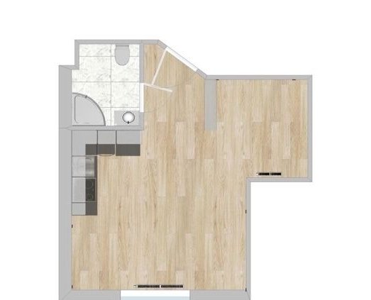 - Kawalerka z aneksem kuchennym i przestrzenią - wnęką, która doskonale nadaje się na część do spania, bądź przestrzeń do pracy, łazienka z prysznicem i wc oraz miejscem na pralkę.