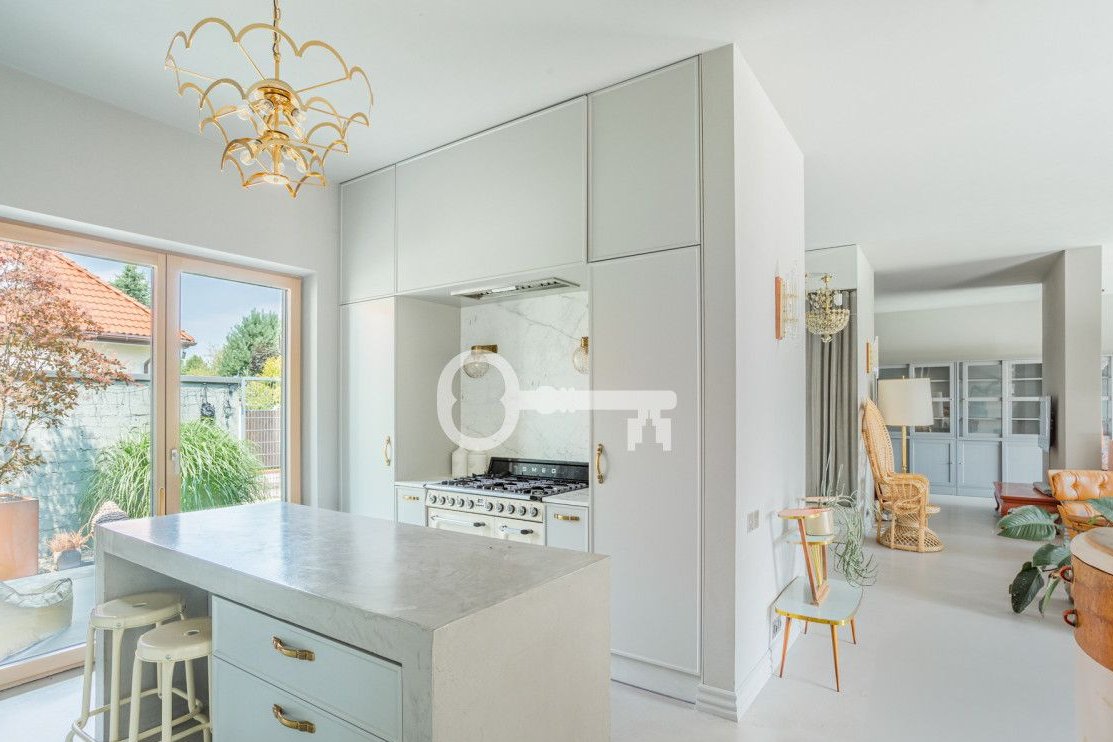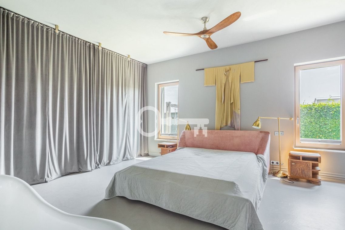 The interior is characterized by an interesting design - combining what is minimalist and modern with a touch of classicism and elements of Eastern culture. Worth highlighting is also the well-thought-out layout: focusing attention on the central living area and providing breathing space in the two private wings. The height of the rooms and large, panoramic windows connecting the interiors with the garden give a sense of space.