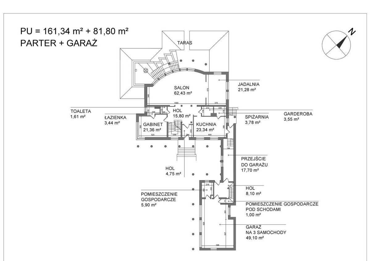 Parter stanowi część reprezentacyjną rezydencji - znajdziemy tu przestronny salon połączony z jadalnią z wyjściem na taras i do ogrodu, kuchnię ze spiżarnią, gabinet połączony z łazienką, a także toaletę dla gości i garderobę na odzież wierzchnią.