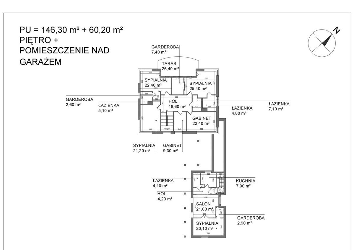 Rezydencja o powierzchni użytkowej 463m2, zaś powierzchni całkowitej 605,2m2 (dom: 463m2, garaż wraz z mieszkaniem nad nim: 142m2) położona na działce o powierzchni 1751m2 w Dąbrowie Leśnej (Łomianki).
