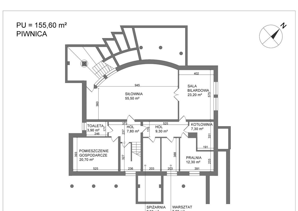 W piwnicy mamy dodatkową przestrzeń - największą jej część stanowi siłownia oraz sala bilardowa, do dyspozycji jest również dodatkowy pokój, który można zaaranżować np. na saunę lub pokój telewizyjny. Na tym poziomie znajdziemy również dodatkową spiżarnię, pomieszczenie warsztatowe, toaletę, pralnię oraz kotłownię.