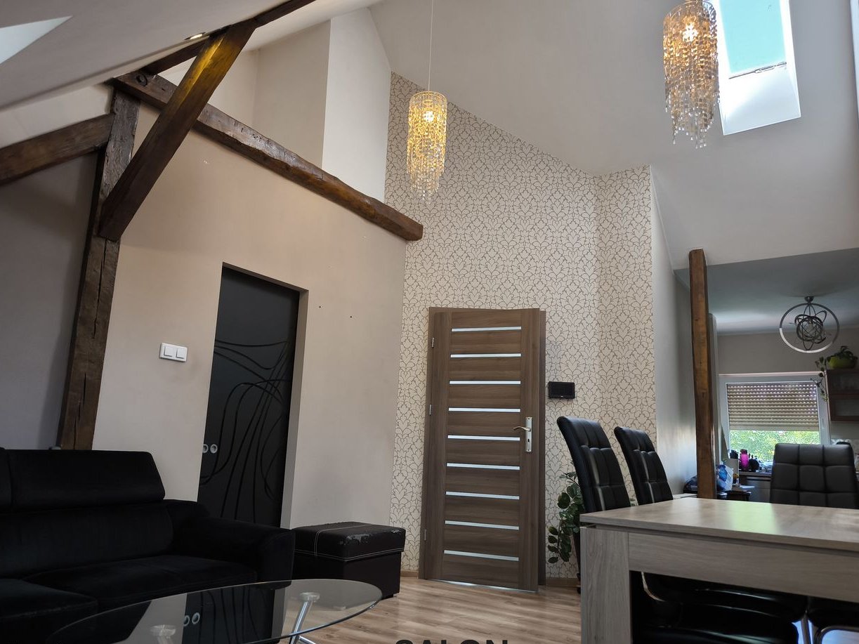 Klimat: Odsłonięte, odrestaurowane drewniane belki i słupy konstrukcji dachu w części pomieszczeń m.in. salonie, sypialni tworzą niezwykły klimat poddasza.