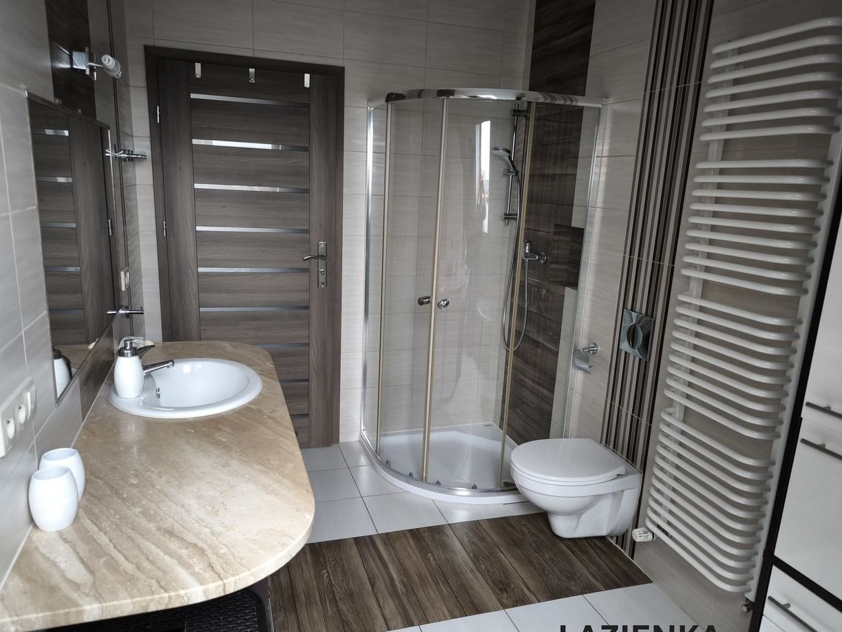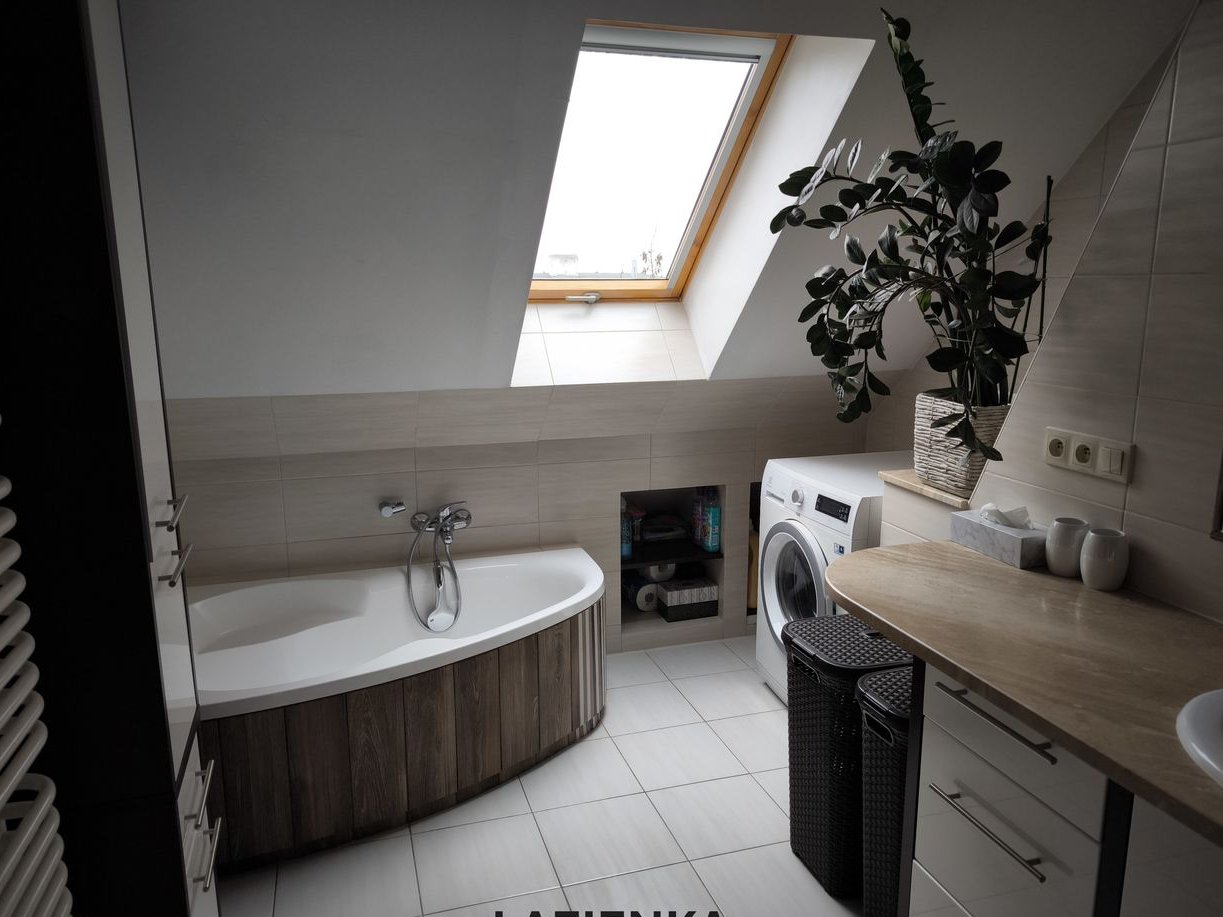 Łazienka główna (pow. ok. 8 m2): Przestronna, jasna z klimatycznym skosem oraz oknem dachowym, wyposażona zarówno w wannę narożną, jak i kabinę prysznicową.