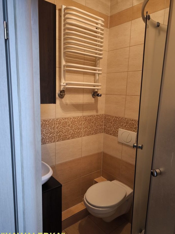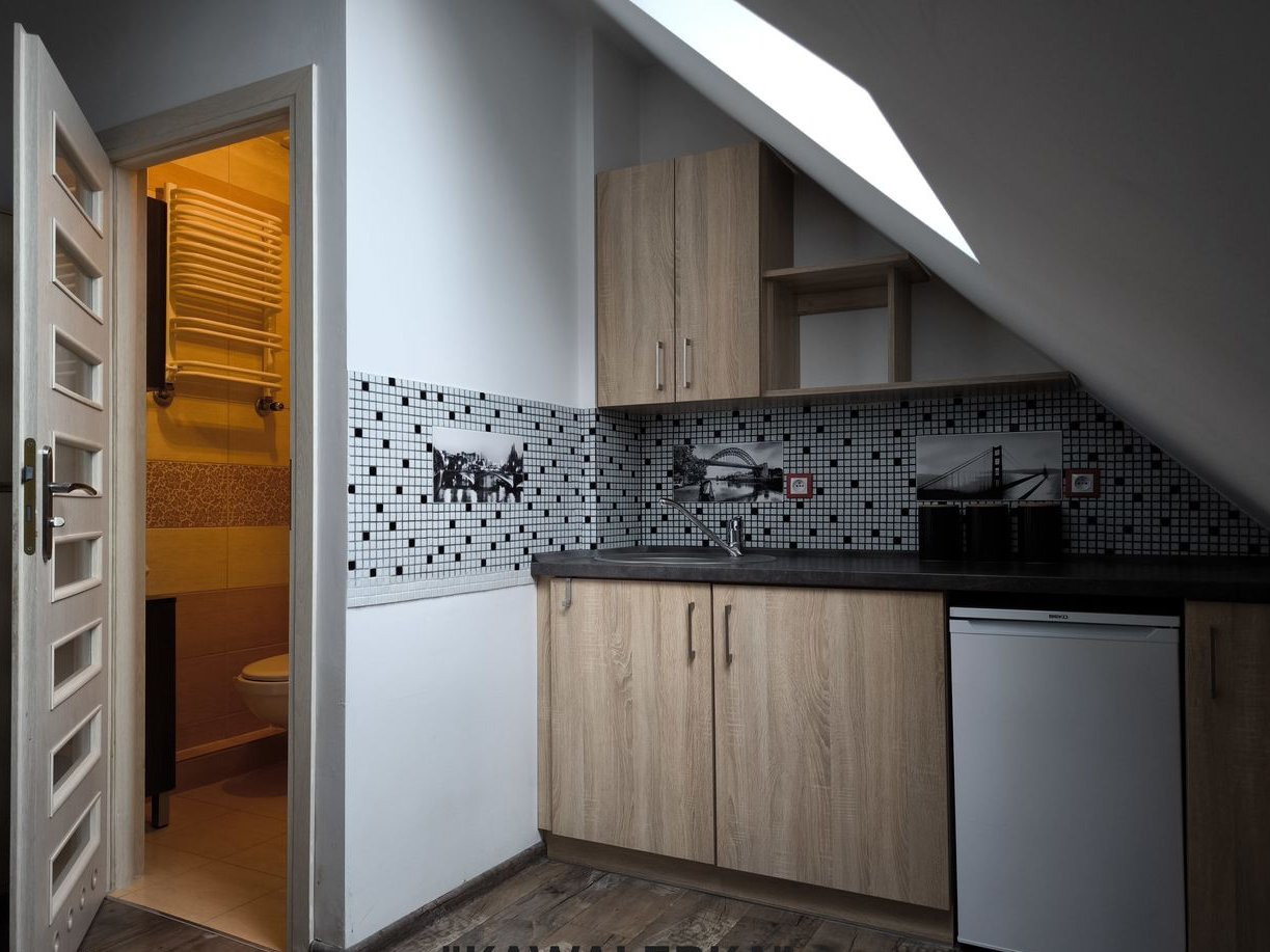 Pokój nr 3 – tzw. "Kawalerka" (pow. ok. 12 m2): Pokój z własną łazienką z prysznicem oraz aneksem kuchennym wyposażonym w lodówkę i umożliwiającym montaż pralki. Pokój posiada także bardzo dużą dodatkową przestrzeń do przechowywania pod skosem dachowym nad wykuszem budynku. Ta część mieszkania została wyodrębniona z myślą o wynajmie i posiada niezależne zamykane wejście ze wspólnego przedpokoju oraz własny domofon.