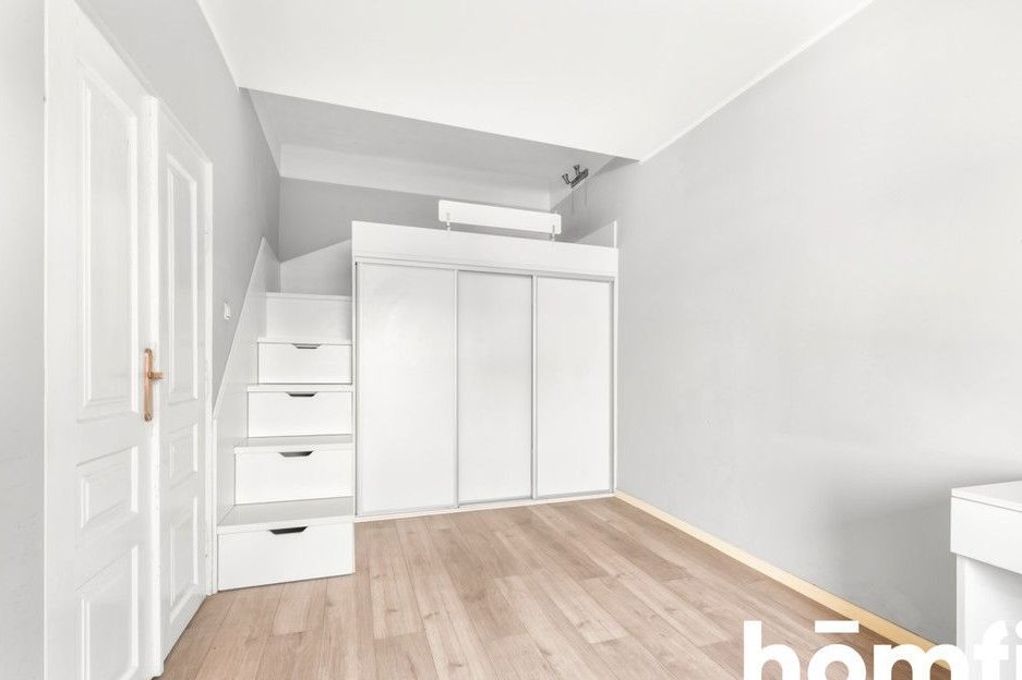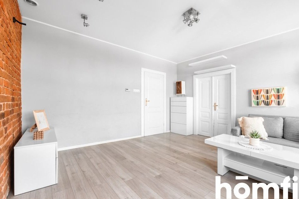 The main part of the apartment is a large and well-arranged living room with beautifully exposed red brick, giving the interior a unique character. Next to the living room is a bedroom, which can also serve as a playroom or home office. In the second part of the apartment, you’ll find a functional kitchen and a bathroom equipped with a shower, toilet, sink, and practical shelving.