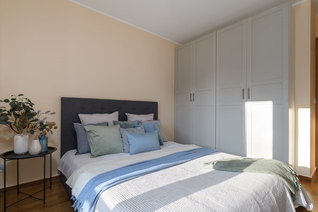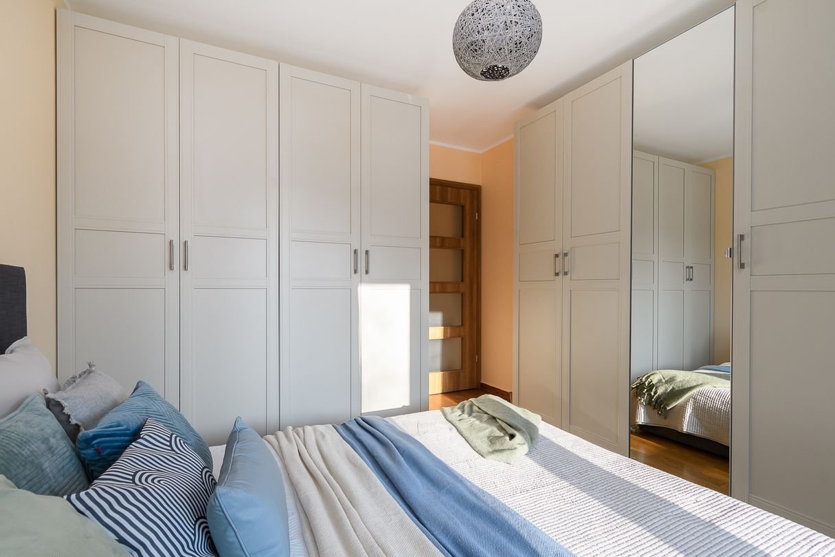 Sypialnia główna - komfortowa, z łóżkiem małżeńskim i pojemnymi szafami