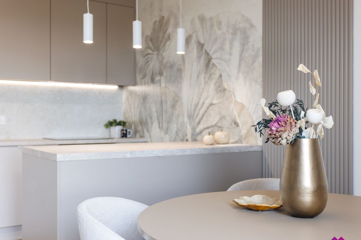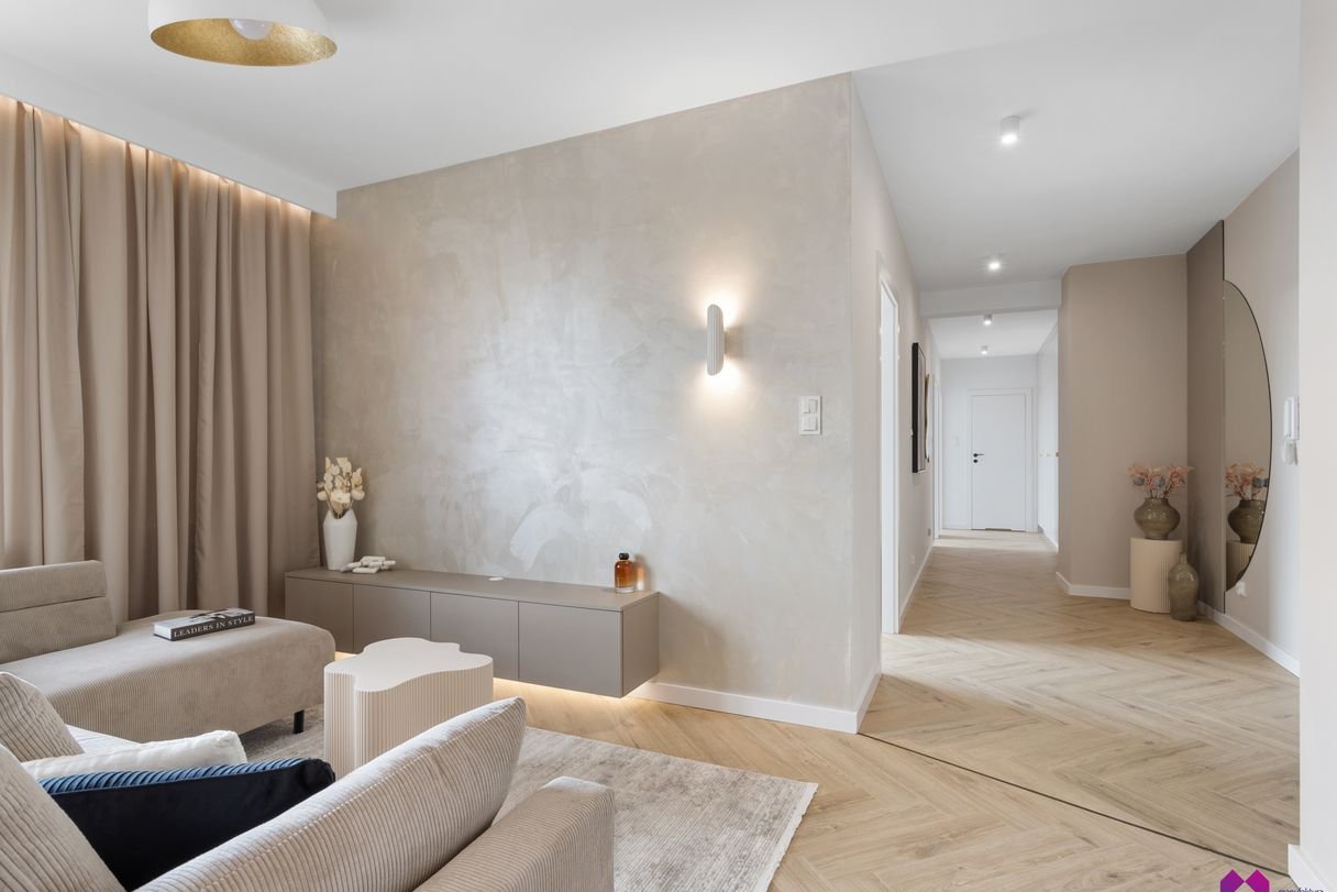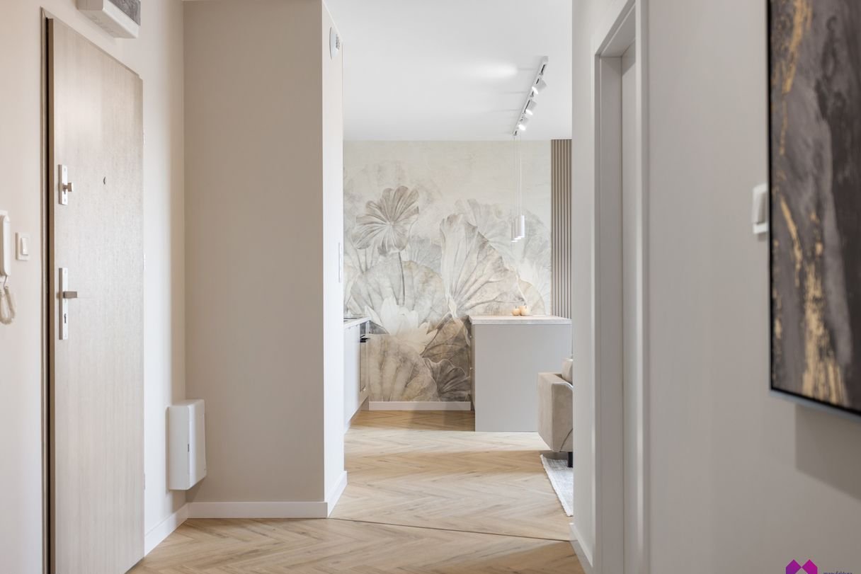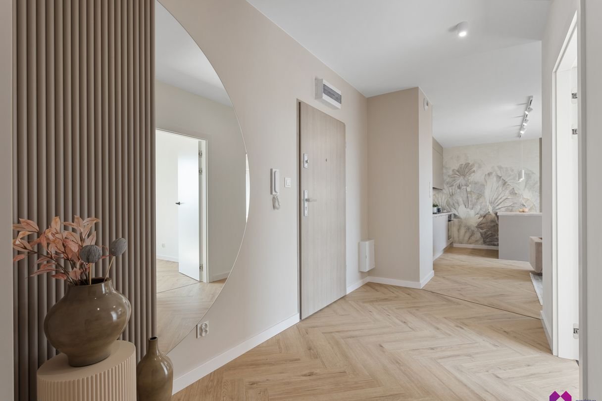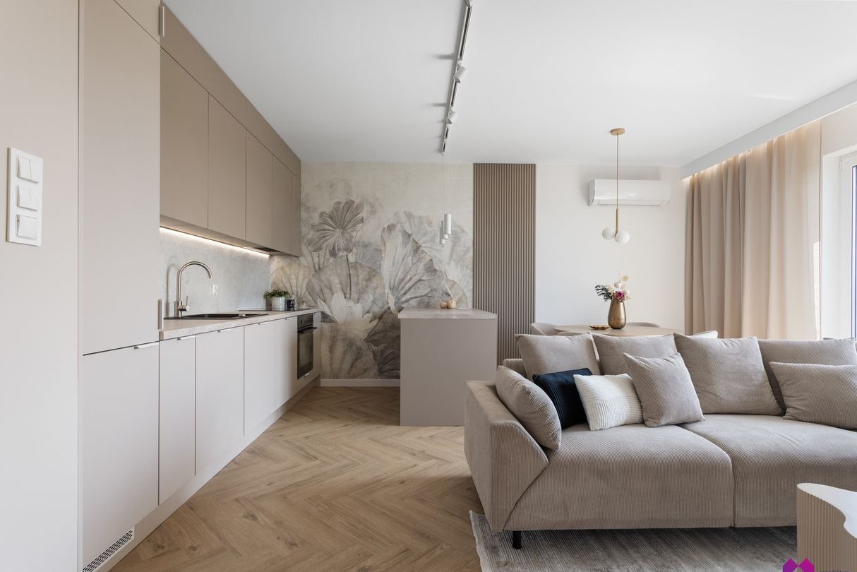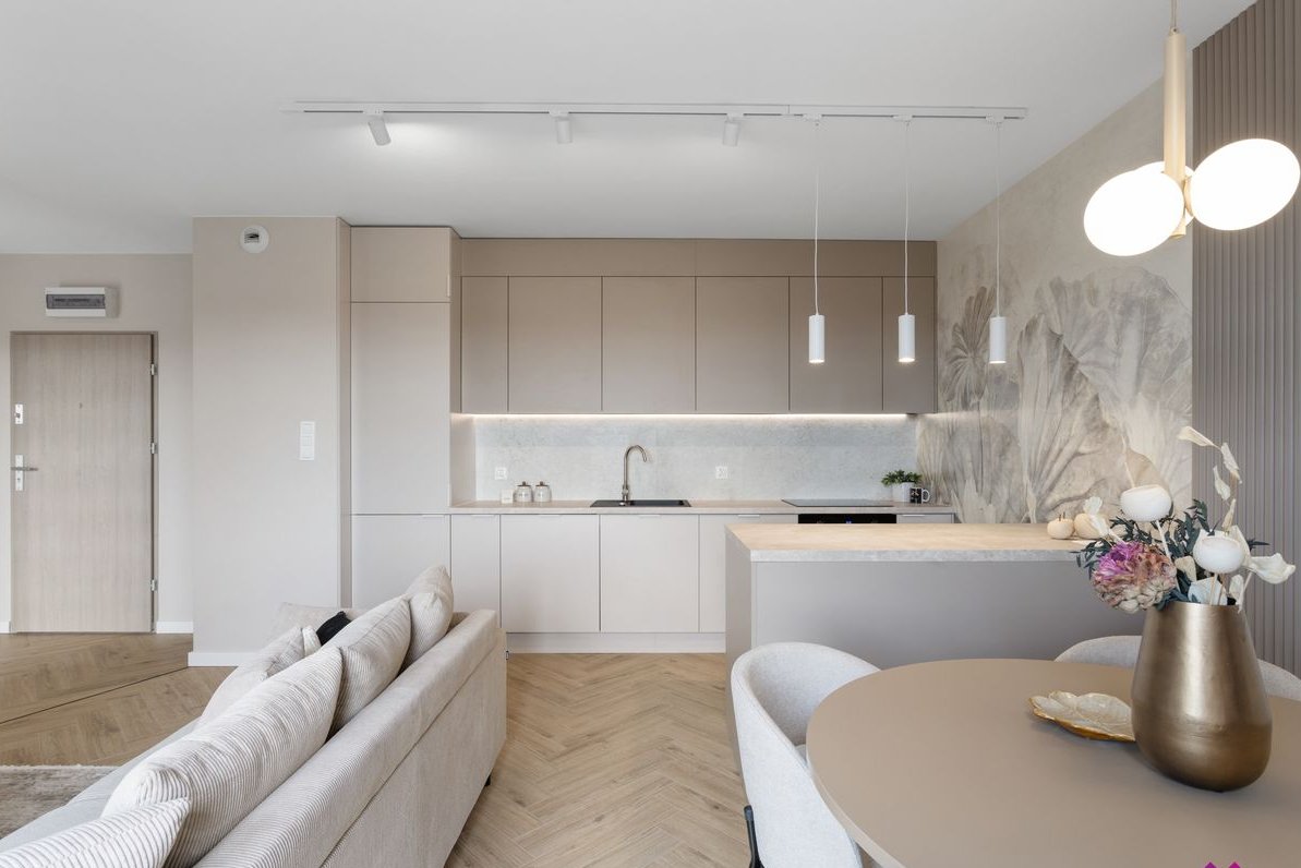Mieszkanie wykończone pod klucz w podwyższonym standardzie. We wnętrzu panują odcienie beżu, bieli, bladego różu oraz drewna oraz co sprawia, że mieszkanie jest niezwykle delikatne, eleganckie i jasne ale również przytulne. Dodatkowo, w celu uzupełnienia wnętrza zastosowano pastelowe i drewniane elementy w postaci dodatków.