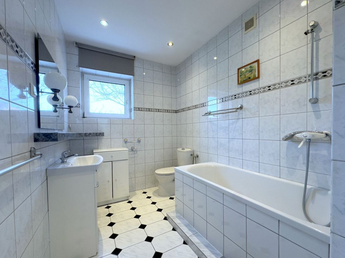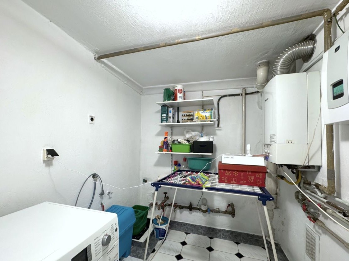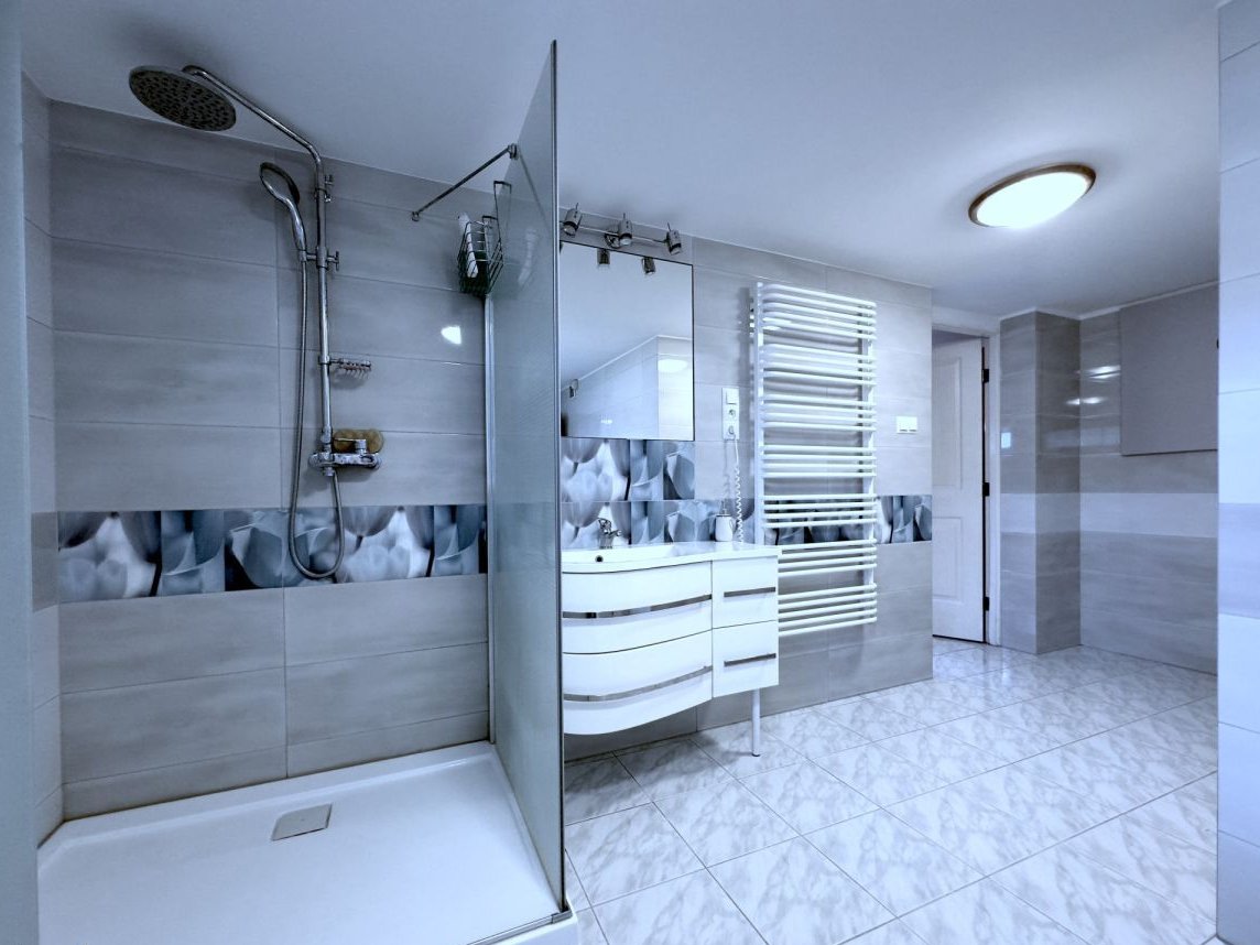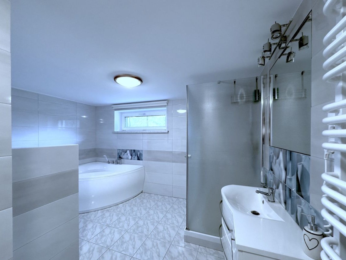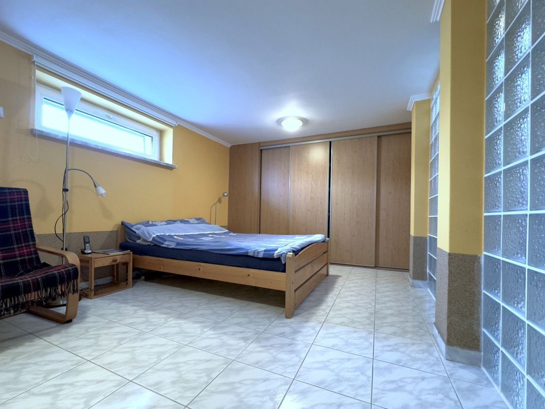 Na uwagę zasługuję doskonałe wykorzystanie całej powierzchni domu w raz z niższym poziomem, na którym z jednej strony znajduje się duży garaż wraz z pomieszczeniem warsztatowym i piwnicznym, z drugiej natomiast (bezpośrednie wejście z mieszkania) ogromna dodatkowa sypialnia, pokój kąpielowy z prysznicem oraz nowoczesną wanną z hydromasażem, kotłownia oraz przedpokój. W kotłowni znajduję się pralnia, 2-funkcyjny piec gazowy oraz dodatkowo elektryczny przepływowy podgrzewacz wody wysokiej klasy. Co prawda pomieszczenia te, z uwagi na ówczesne normy, mają wysokość ok 220 cm ale w niczym to nie przeszkadza. Jest tam ładnie, przytulnie i ciepło. Strefa dolna została wyremontowana 8 lat temu i również na całej jej powierzchni znajduje się wodne ogrzewanie podłogowe.