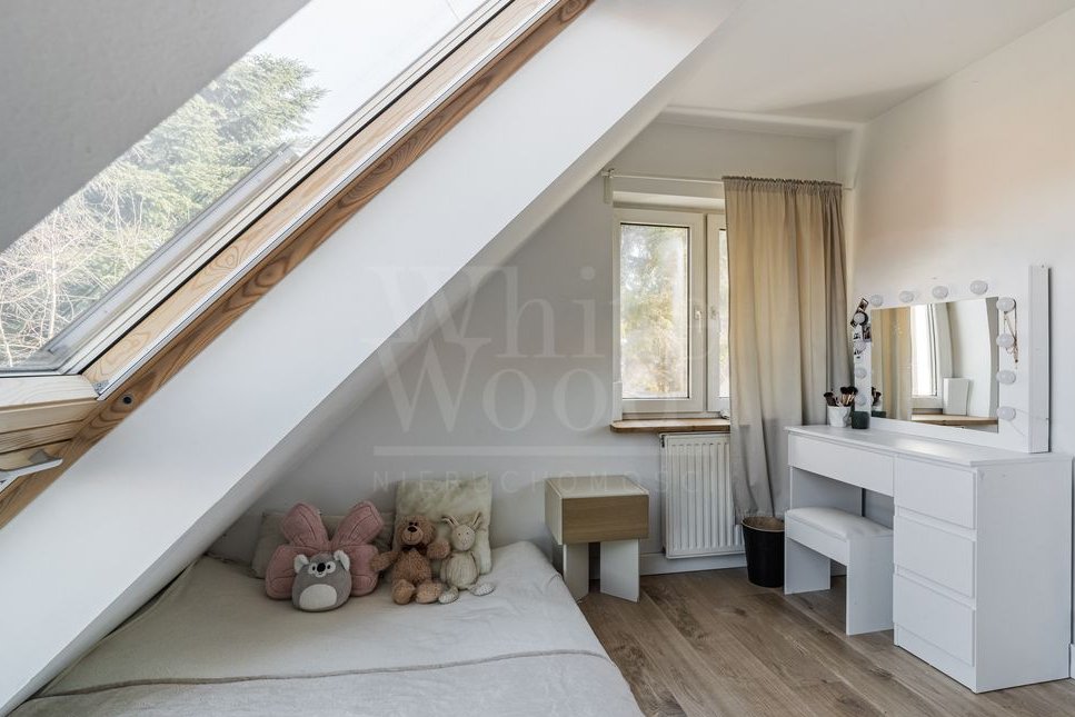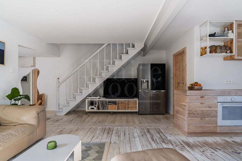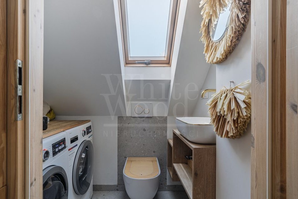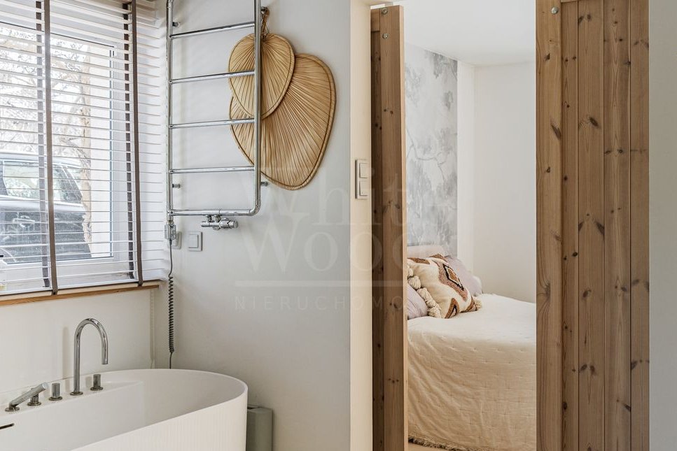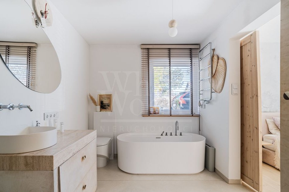 Dom jest jasny, dobrze doświetlony. Wnętrze spójnie zaaranżowane przez architekta z użyciem naturalnych materiałów typu kamień czy drewno. Układ funkcjonalny i zaprojektowany tak, aby wygodnie mieszkało się tam rodzinie.
