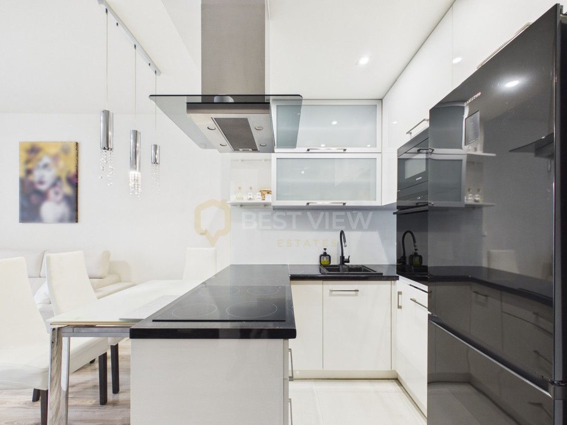 - Kuchnia w pełni zabudowana, komplet sprzętu AGD (lodówka, zmywarka, piekarnik, mikrofalówka, płyta, pralka), klimatyzacja, zabudowy meblowe.