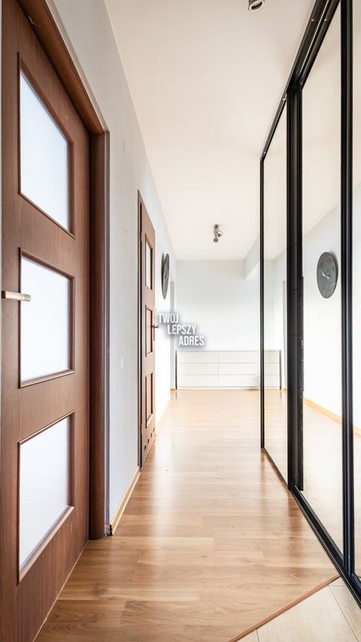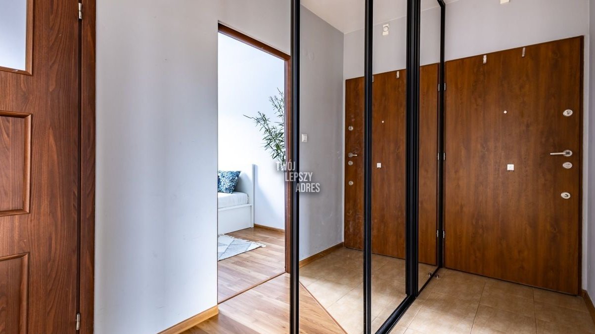 W przedpokoju jest duża szafa na wymiar z przesuwnymi lustrzanymi drzwiami.