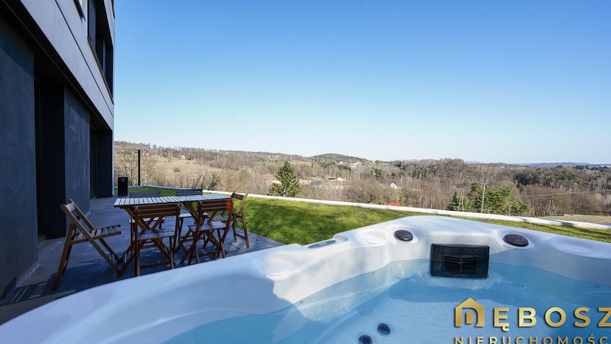 Dodatkowym atutem jest taras z prywatnym jacuzzi, strefa grillowa oraz miejsce na ognisko.