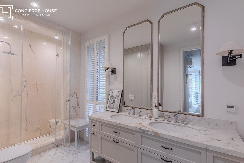 Wnętrze zaprojektowane przez Zen Interiors – z dbałością o detal i harmonię kolorów. Materiały klasy premium: marmur Rosa Portugale, płytki Marazzi, armatura Marantes, Villeroy & Boch, a schody i podłogi wykonano z litego dębu. Część wyposażenia sprowadzono ze Stanów Zjednoczonych. Wnętrze docenione i opublikowane na łamach magazynów Weranda oraz włoski magazyn Dentrocasa.