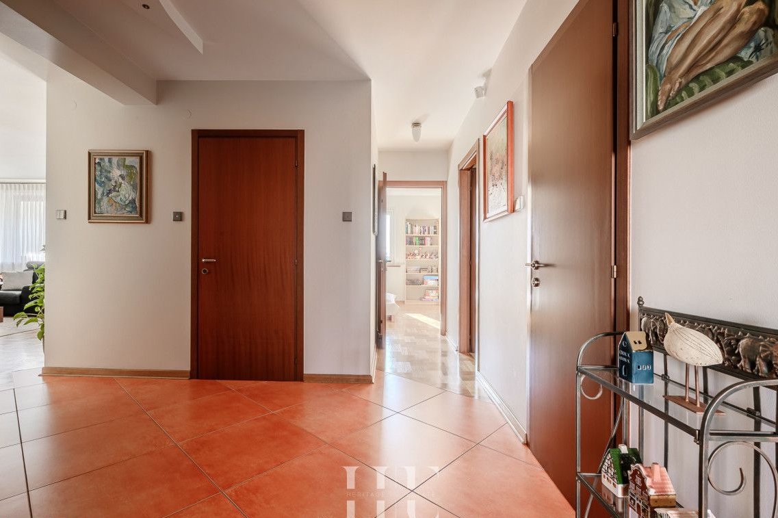 duży przedpokój z miejscem na okrycia wierzchnie oraz garderobą.