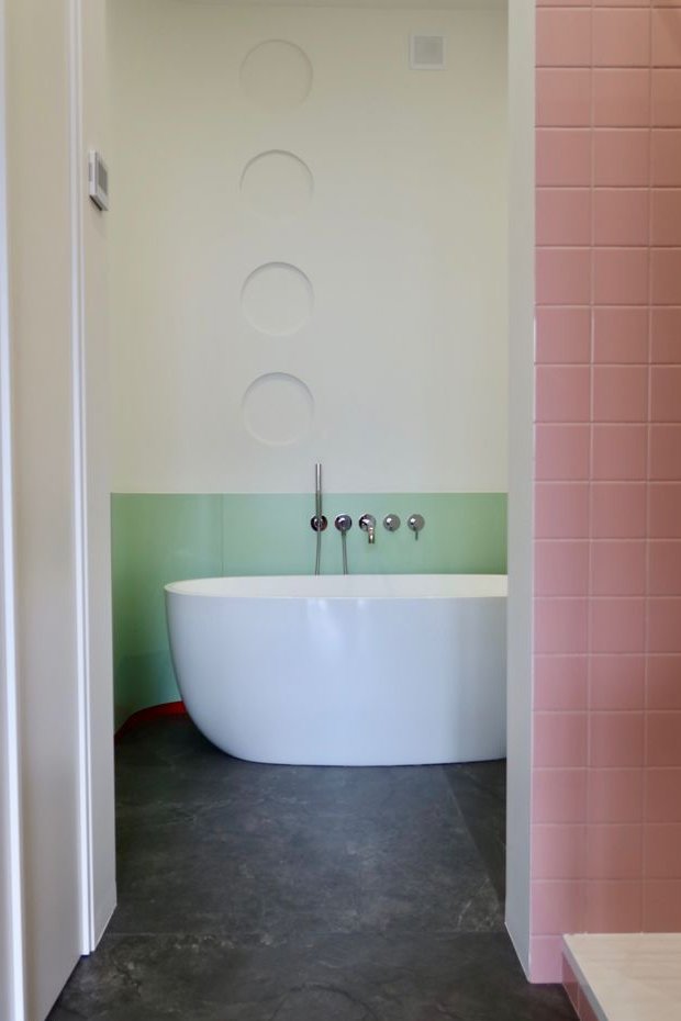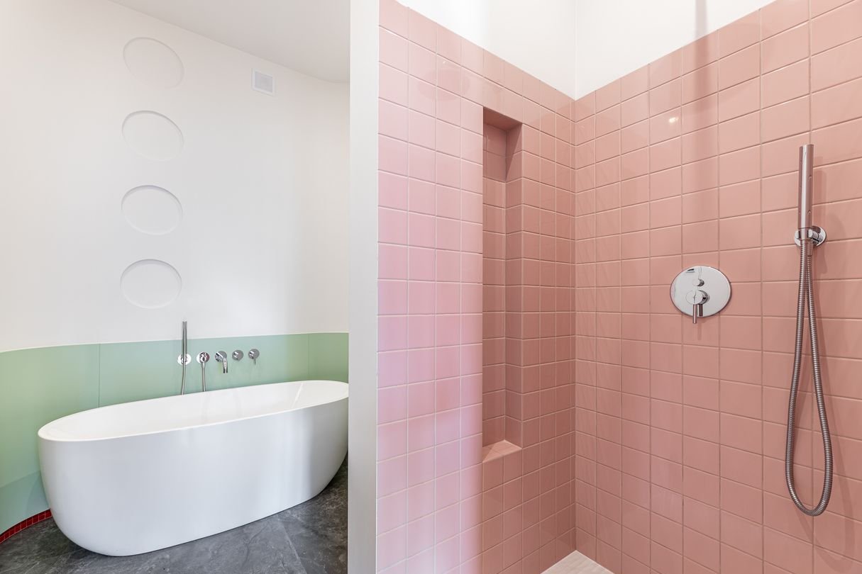łazienka z wanną wolnostojącą, prysznicem i ogrzewaniem podłogowym